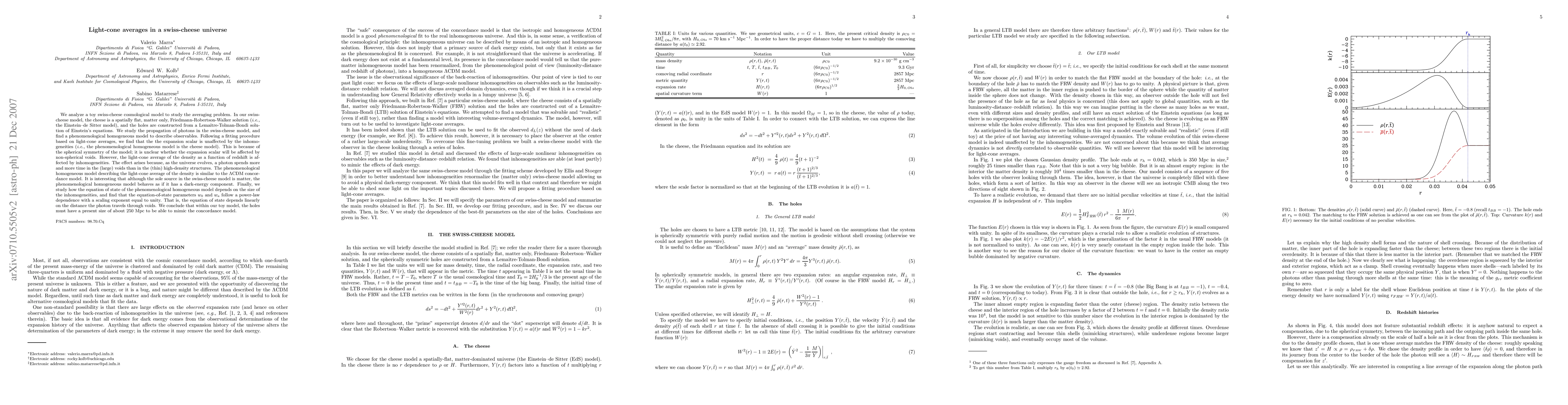 This paper examines a swiss-cheese cosmological model where the cheese represents an EdS model and the holes are LTB solutions. The study finds that while the expansion scalar remains unaffected by inhomogeneities due to spherical symmetry, the light-cone average density is influenced, mimicking a dark-energy component in a homogeneous model. The equation of state parameters depend linearly on the size of the voids, suggesting holes of about 250 Mpc are needed to match the concordance model.
