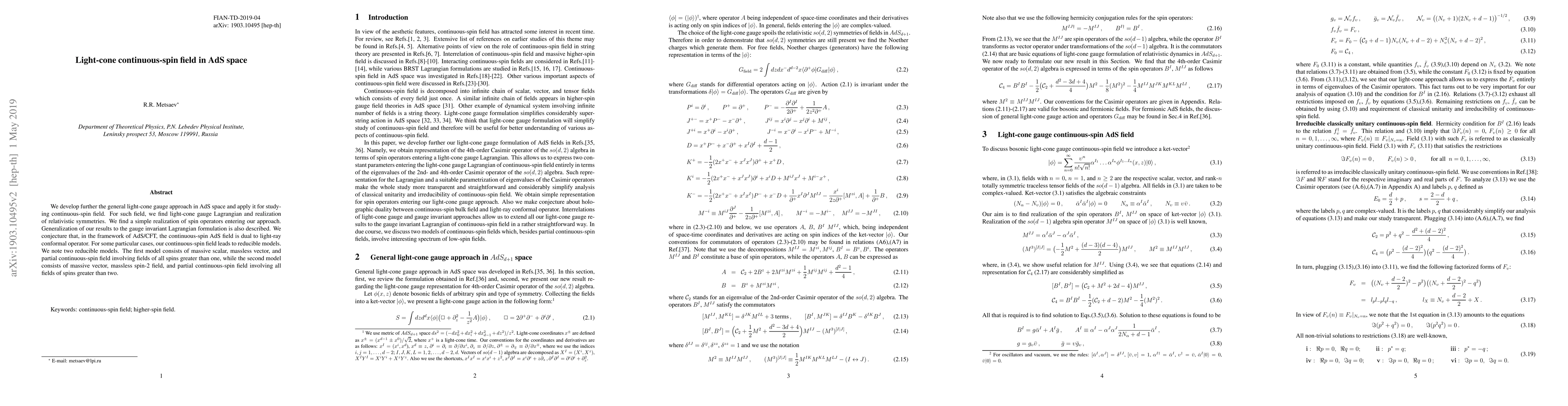 This paper develops a light-cone gauge approach for continuous-spin fields in AdS space, presenting a Lagrangian and symmetries for such fields. It also conjectures an AdS/CFT duality between continuous-spin fields and light-ray conformal operators, and identifies two reducible models involving scalar, vector, and higher-spin fields.