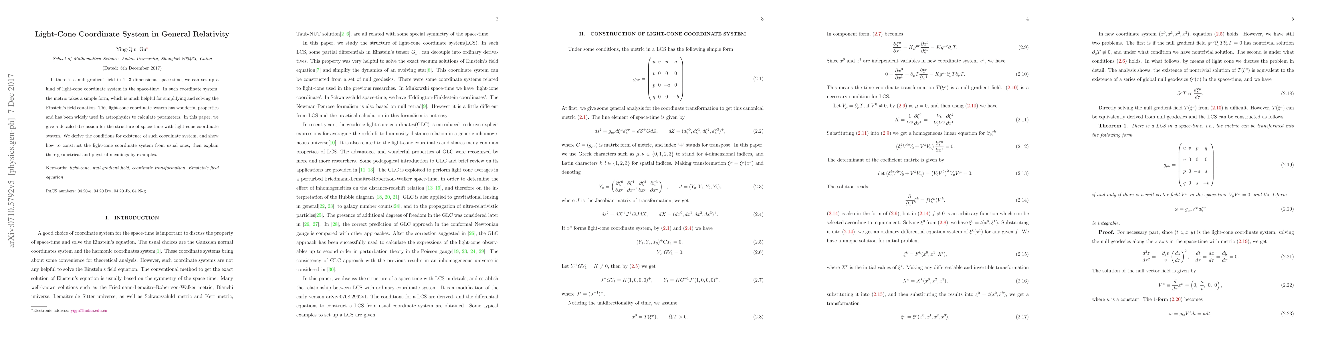 This paper discusses the light-cone coordinate system for simplifying Einstein's field equations in general relativity, deriving conditions for its existence and demonstrating its construction from standard coordinates. It highlights the system's utility in astrophysics for parameter calculations.