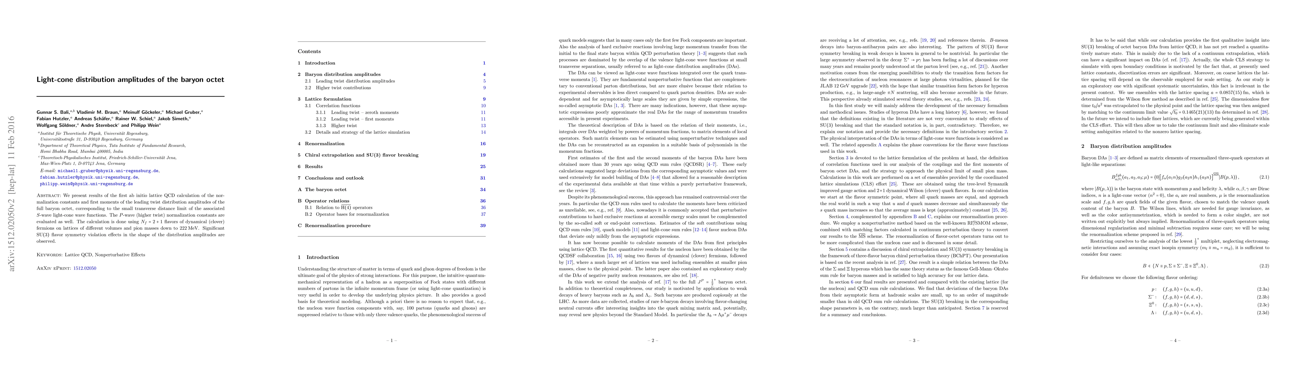 We present results of the first ab initio lattice QCD calculation of the normalization constants and first moments of the leading twist distribution amplitudes of the full baryon octet, corresponding to the small transverse distance limit of the associated S-wave light-cone wave functions. The P-wave (higher twist) normalization constants are evaluated as well. The calculation is done using $N_f=2+1$ flavors of dynamical (clover) fermions on lattices of different volumes and pion masses down to 222 MeV. Significant SU(3) flavor symmetry violation effects in the shape of the distribution amplitudes are observed.