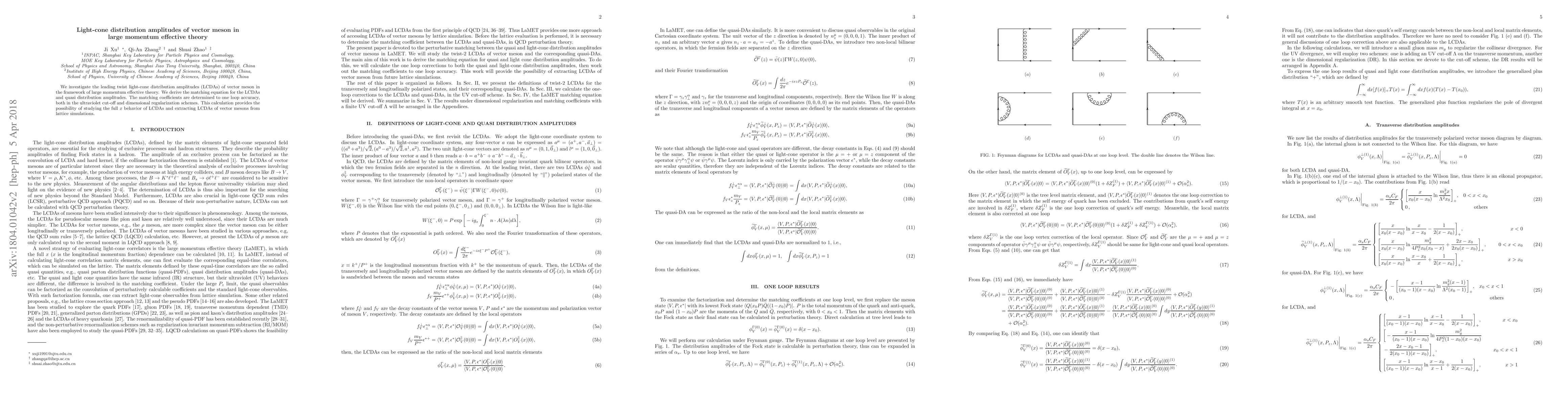 We investigate the leading twist light-cone distribution amplitudes (LCDAs) of vector meson in the framework of large momentum effective theory. We derive the matching equation for the LCDAs and quasi distribution amplitudes. The matching coefficients are determined to one loop accuracy, both in the ultraviolet cut-off and dimensional regularization schemes. This calculation provides the possibility of studying the full $x$ behavior of LCDAs and extracting LCDAs of vector mesons from lattice simulations.