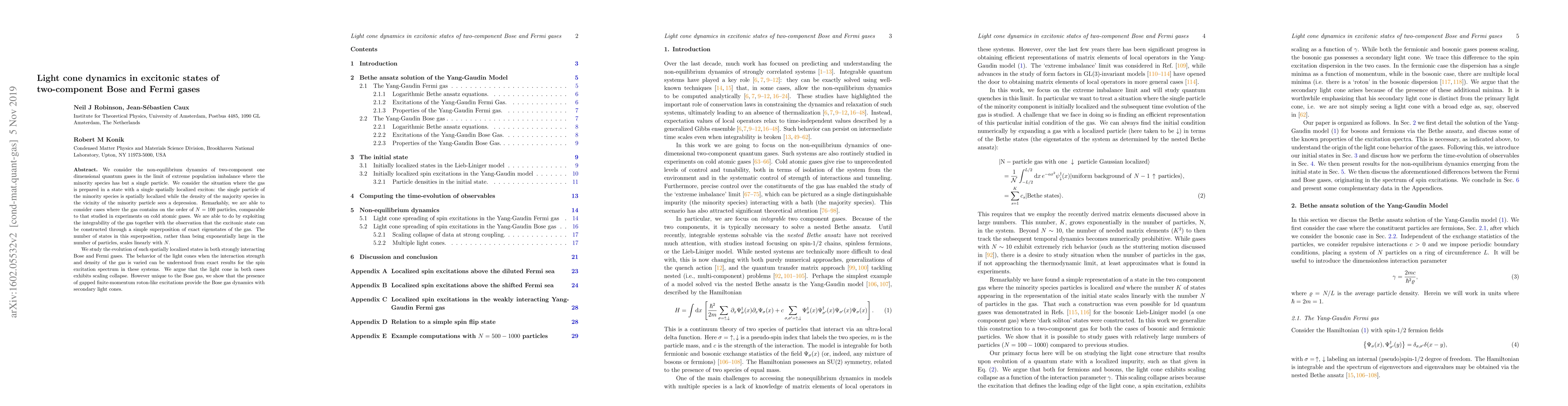 This research paper investigates the non-equilibrium dynamics of two-component Bose and Fermi gases with a single spatially localized exciton, finding that both exhibit scaling collapse in their light cone behavior, but the Bose gas has secondary light cones due to gapped roton-like excitations.