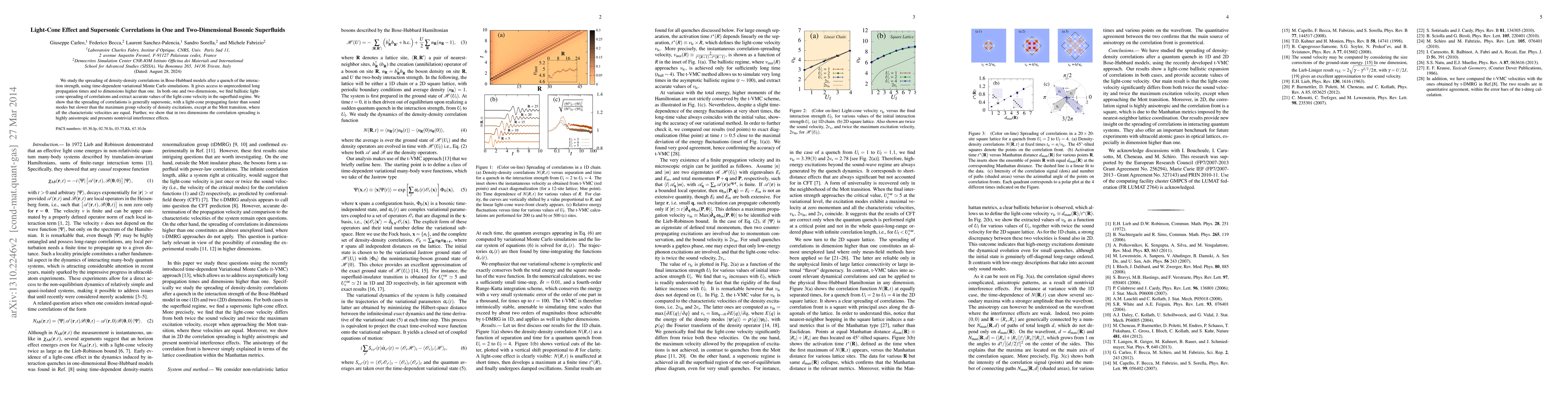 This paper investigates the spreading of density-density correlations in bosonic superfluids after a quench, revealing ballistic light-cone spreading and supersonic correlation propagation. The study highlights anisotropic and interference effects in two-dimensional systems, with velocities differing except at the Mott transition.