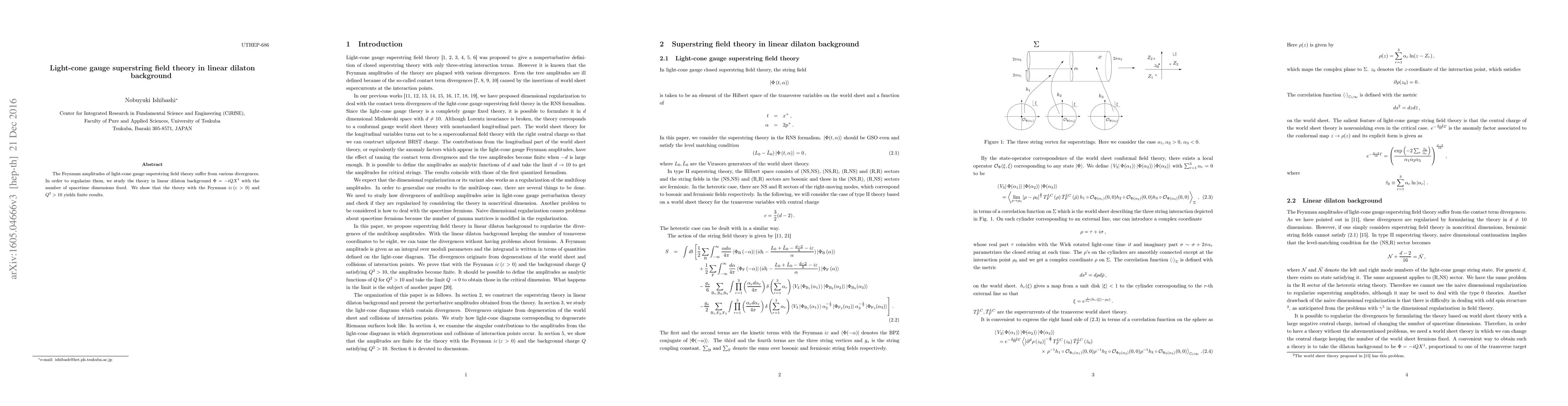 The Feynman amplitudes of light-cone gauge superstring field theory suffer from various divergences. In order to regularize them, we study the theory in linear dilaton background $\Phi =-iQX^1$ with the number of spacetime dimensions fixed. We show that the theory with the Feynman $i\varepsilon\,(\varepsilon>0)$ and $Q^{2}>10$ yields finite results.