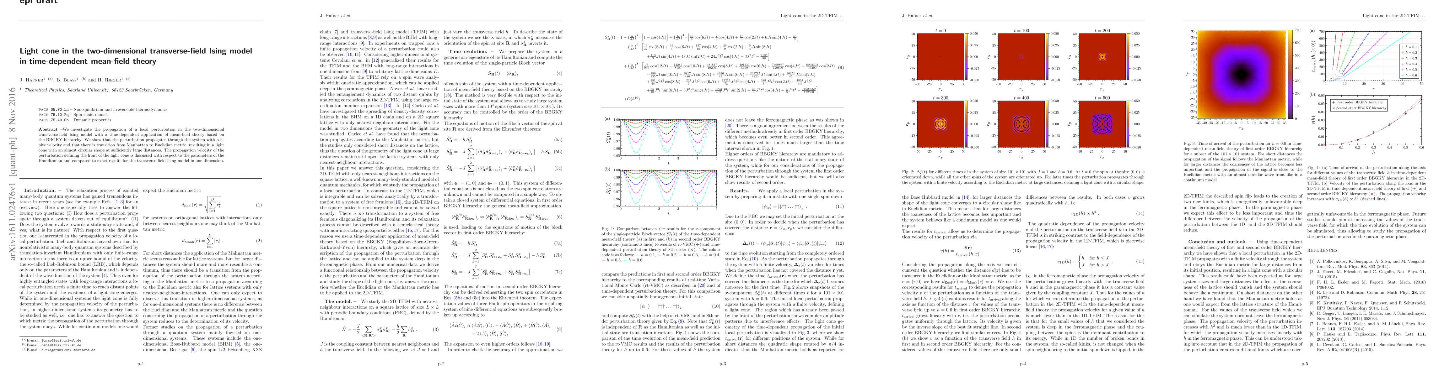 We investigate the propagation of a local perturbation in the two-dimensional transverse-field Ising model with a time-dependent application of mean-field theory based on the BBGKY hierarchy. We show that the perturbation propagates through the system with a finite velocity and that there is transition from Manhattan to Euclidian metric, resulting in a light cone with an almost circular shape at sufficiently large distances. The propagation velocity of the perturbation defining the front of the light cone is discussed with respect to the parameters of the Hamiltonian and compared to exact results for the transverse-field Ising model in one dimension.