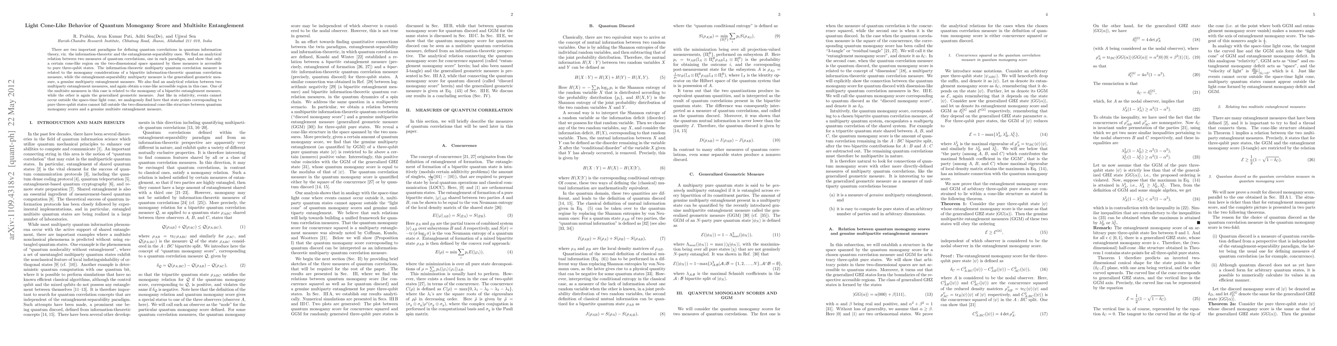 There are two important paradigms for defining quantum correlations in quantum information theory, viz. the information-theoretic and the entanglement-separability ones. We find an analytical relation between two measures of quantum correlations, one in each paradigm, and show that only a certain cone-like region on the two-dimensional space spanned by these measures is accessible to pure three-qubit states. The information-theoretic multiparty quantum correlation measure is related to the monogamy considerations of a bipartite information-theoretic quantum correlation measure, while the entanglement-separability multiparty measure is the generalized geometric measure, a genuine multiparty entanglement measure. We also find an analytical relation between two multiparty entanglement measures, and again obtain a cone-like accessible region in this case. One of the multisite measures in this case is related to the monogamy of a bipartite entanglement measure, while the other is again the generalized geometric measure. Just like in relativity, events cannot occur outside the space-time light cone, we analogously find here that state points corresponding to pure three-qubit states cannot fall outside the two-dimensional cone-like structure between quantum monogamy scores and a genuine multisite entanglement measure.