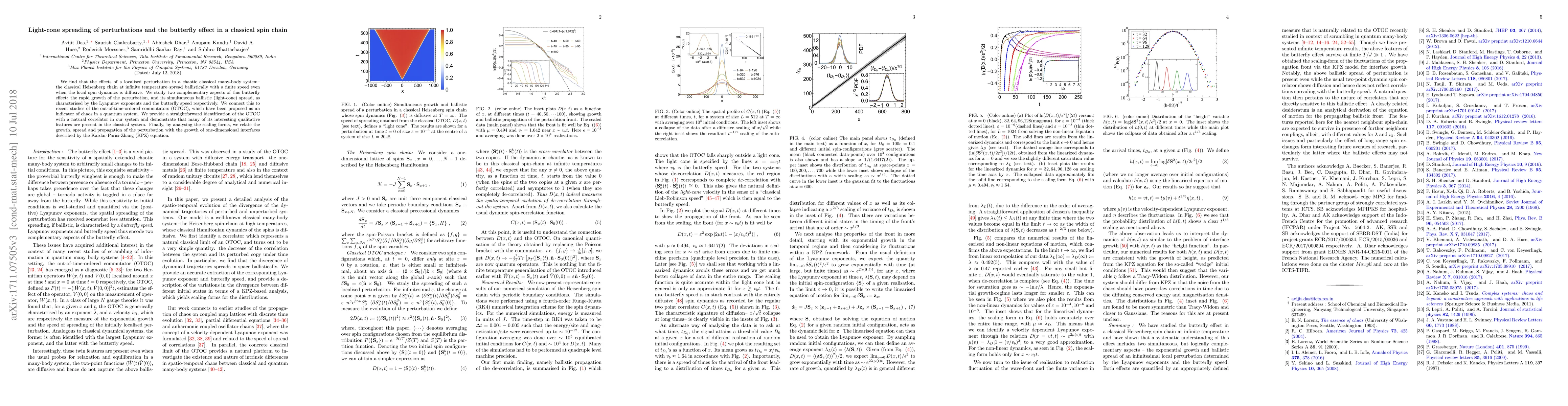 We find that localised perturbations in a chaotic classical many-body system-- the classical Heisenberg We find that the effects of a localised perturbation in a chaotic classical many-body system--the classical Heisenberg chain at infinite temperature--spread ballistically with a finite speed even when the local spin dynamics is diffusive. We study two complementary aspects of this butterfly effect: the rapid growth of the perturbation, and its simultaneous ballistic (light-cone) spread, as characterised by the Lyapunov exponents and the butterfly speed respectively. We connect this to recent studies of the out-of-time-ordered commutators (OTOC), which have been proposed as an indicator of chaos in a quantum system. We provide a straightforward identification of the OTOC with a natural correlator in our system and demonstrate that many of its interesting qualitative features are present in the classical system. Finally, by analysing the scaling forms, we relate the growth, spread and propagation of the perturbation with the growth of one-dimensional interfaces described by the Kardar-Parisi-Zhang (KPZ) equation.