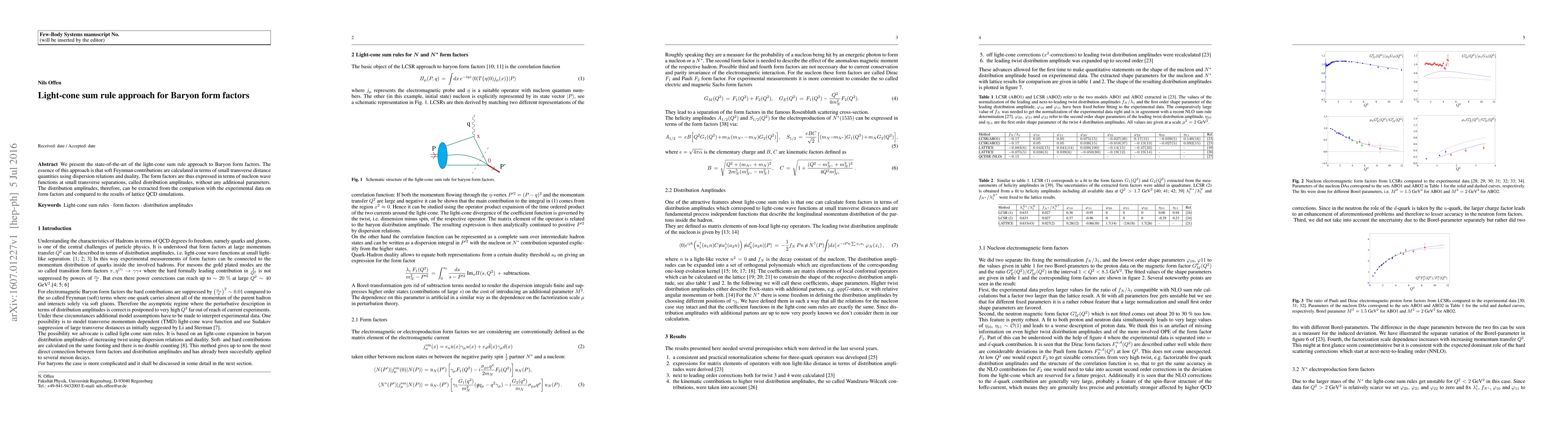 The light-cone sum rule approach is a method that calculates Baryon form factors using dispersion relations and duality, resulting in distribution amplitudes that can be compared to experimental data and lattice QCD simulations.