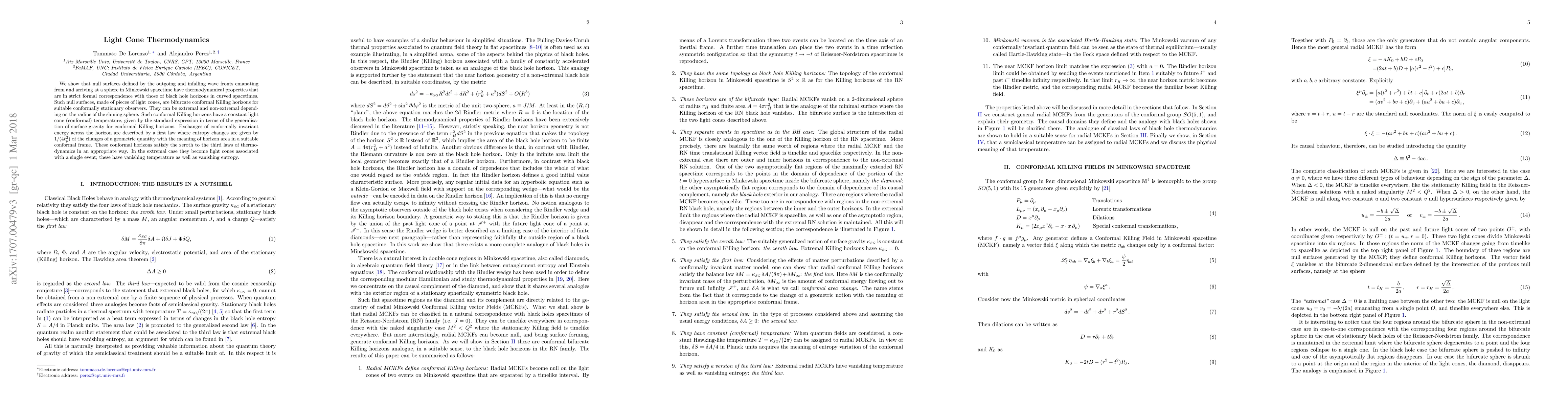 We show that null surfaces defined by the outgoing and infalling wave fronts emanating from and arriving at a sphere in Minkowski spacetime have thermodynamical properties that are in strict formal correspondence with those of black hole horizons in curved spacetimes. Such null surfaces, made of pieces of light cones, are bifurcate conformal Killing horizons for suitable conformally stationary observers. They can be extremal and non-extremal depending on the radius of the shining sphere. Such conformal Killing horizons have a constant light cone (conformal) temperature, given by the standard expression in terms of the generalisation of surface gravity for conformal Killing horizons. Exchanges of conformally invariant energy across the horizon are described by a first law where entropy changes are given by $1/(4\ell_p^2)$ of the changes of a geometric quantity with the meaning of horizon area in a suitable conformal frame. These conformal horizons satisfy the zeroth to the third laws of thermodynamics in an appropriate way. In the extremal case they become light cones associated with a single event; these have vanishing temperature as well as vanishing entropy.