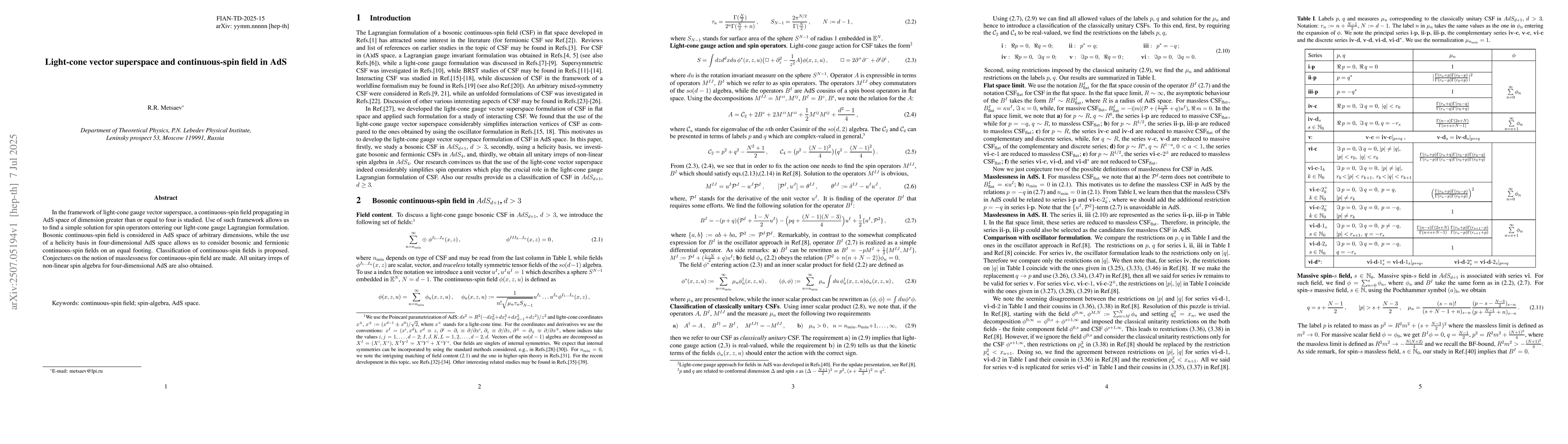 In the framework of light-cone gauge vector superspace, a continuous-spin field propagating in AdS space of dimension greater than or equal to four is studied. Use of such framework allows us to find a simple solution for spin operators entering our light-cone gauge Lagrangian formulation. Bosonic continuous-spin field is considered in AdS space of arbitrary dimensions, while the use of a helicity basis in four-dimensional AdS space allows us to consider bosonic and fermionic continuous-spin fields on an equal footing. Classification of continuous-spin fields is proposed. Conjectures on the notion of masslessness for continuous-spin field are made. All unitary irreps of non-linear spin algebra for four-dimensional AdS are also obtained.