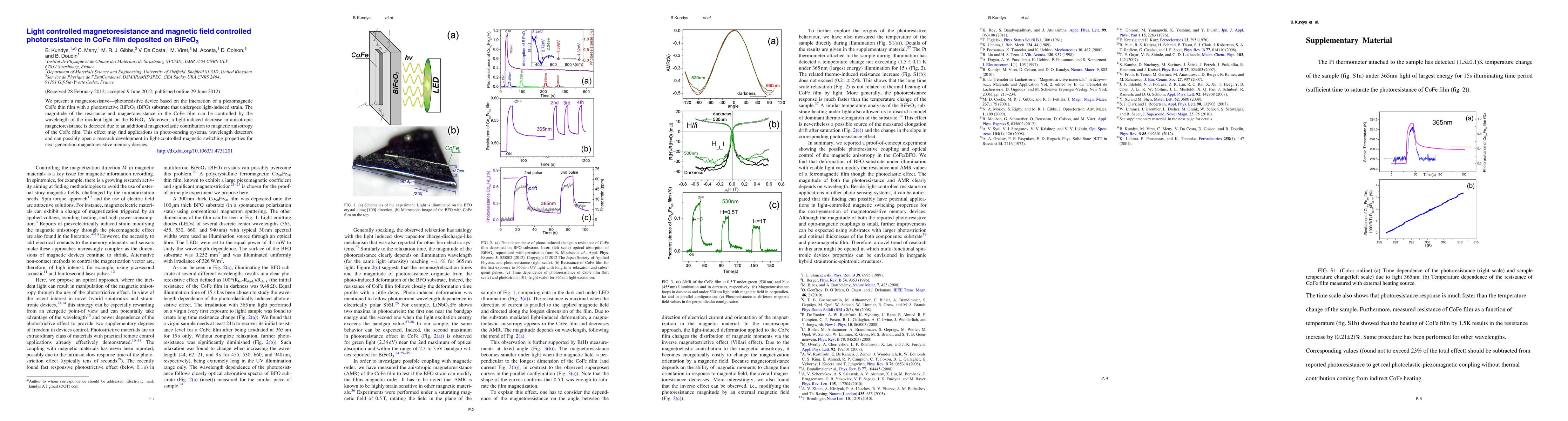 This paper presents a magnetoresistive-photoresistive device where CoFe film's resistance and magnetoresistance are controlled by light incident on a BiFeO3 substrate, which induces strain. The study also reveals a light-induced decrease in anisotropic magnetoresistance due to magnetoelastic effects, suggesting potential applications in photo-sensing and next-generation memory devices.