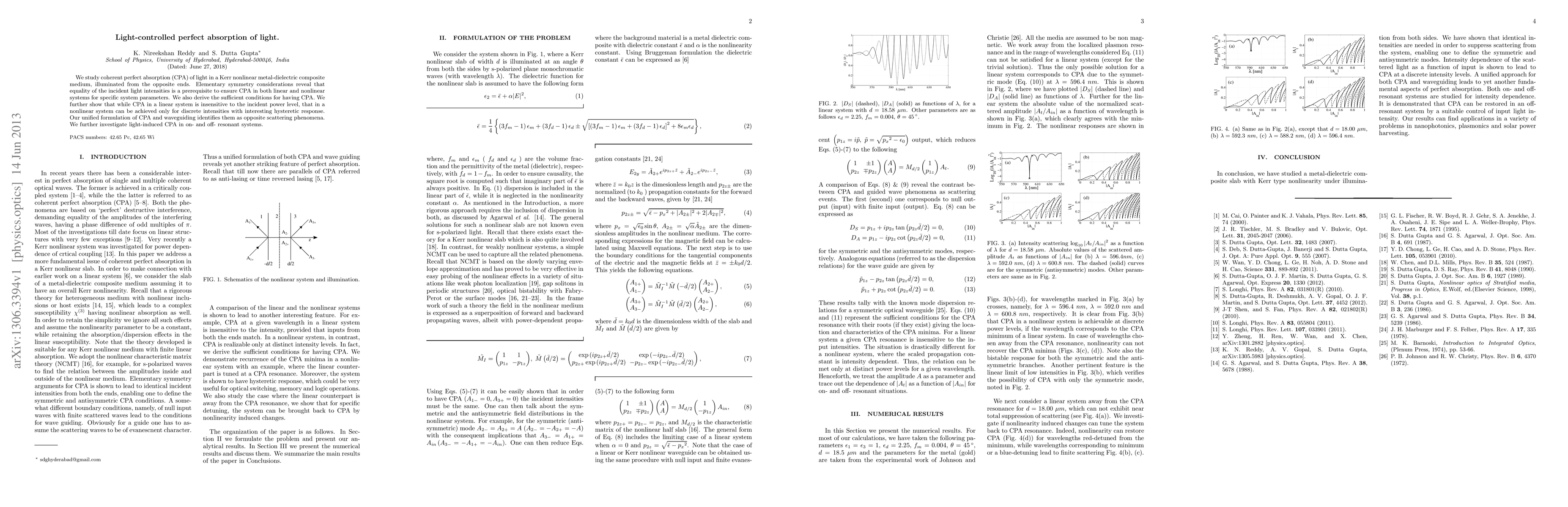 We study coherent perfect absorption (CPA) of light in a Kerr nonlinear metal-dielectric composite medium, illuminated from the opposite ends. Elementary symmetry considerations reveal that equality of the incident light intensities is a prerequisite to ensure CPA in both linear and nonlinear systems for specific system parameters. We also derive the sufficient conditions for having CPA. We further show that while CPA in a linear system is insensitive to the incident power level, that in a nonlinear system can be achieved only for discrete intensities with interesting hysteretic response. Our unified formulation of CPA and waveguiding identifies them as opposite scattering phenomena. We further investigate light-induced CPA in on- and off- resonant systems.