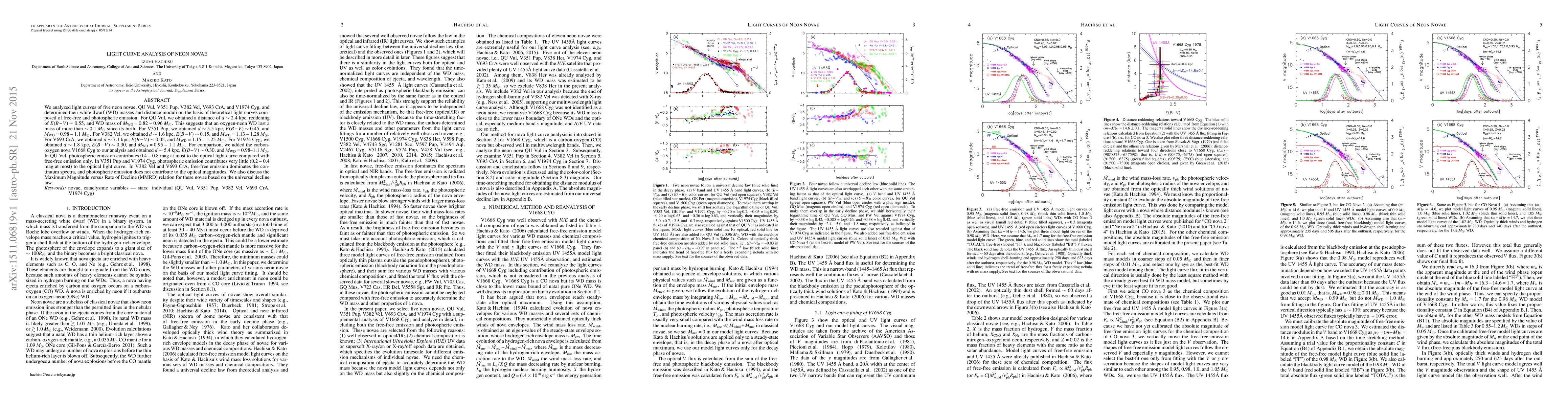 This study analyzes the light curves of five neon novae to determine their white dwarf masses and distance moduli, revealing significant mass loss in oxygen-neon white dwarfs and confirming the dominance of free-free emission in some cases. The MMRD relation is also discussed based on the universal decline law.