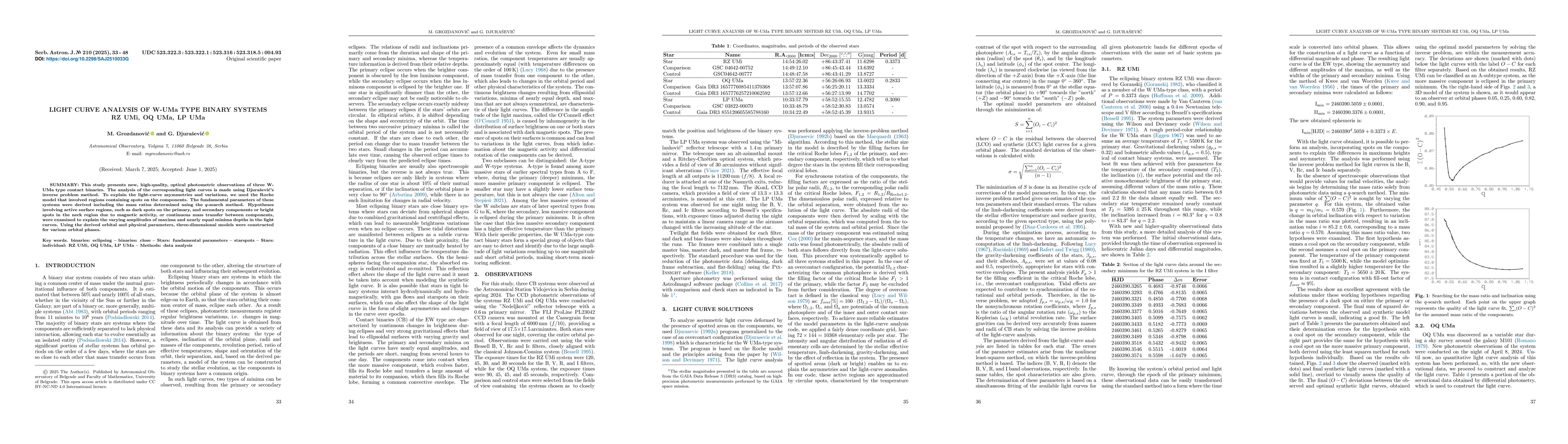 This study presents new, high-quality, optical photometric observations of three W UMa type contact binaries. The analysis of the corresponding light curves is made using Djurasevic's inverse problem method. To explain the light curve asymmetries and variations, we used the Roche model that involved regions containing spots on the components. The fundamental parameters of these systems were derived, including the mass ratios determined using the q-search method. Hypotheses involving active surface regions, such as dark spots on the primary and secondary components, or bright spots in the neck region due to magnetic activity or continuous mass transfer between components, were examined to explain the varying amplitudes of maxima and nearly equal minima depths in the light curves. Using the derived orbital and physical parameters, three-dimensional models were constructed for various orbital phases.