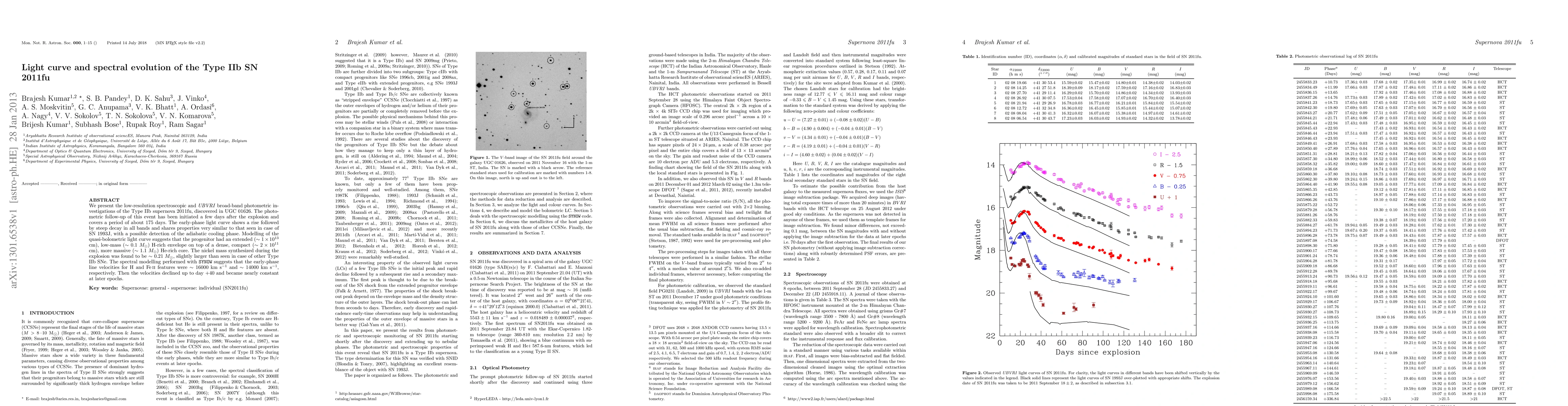 We present the low-resolution spectroscopic and UBVRI broad-band photometric investigations of the Type IIb supernova 2011fu, discovered in UGC 01626. The photometric follow-up of this event has been initiated a few days after the explosion and covers a period of about 175 days. The early-phase light curve shows a rise followed by steep decay in all bands and shares properties very similar to that seen in case of SN 1993J, with a possible detection of the adiabatic cooling phase. Modelling of the quasi-bolometric light curve suggests that the progenitor had an extended ($\sim 1 \times 10^{13}$ cm), low-mass ($\sim 0.1$ $M_\odot$) H-rich envelope on top of a dense, compact ($\sim 2 \times 10^{11}$ cm), more massive ($\sim$ 1.1 $M_\odot$) He-rich core. The nickel mass synthesized during the explosion was found to be $\sim$ 0.21 $M_\odot$, slightly larger than seen in case of other Type IIb SNe. The spectral modelling performed with SYNOW suggests that the early-phase line velocities for H and Fe\,{\sc ii} features were $\sim 16000$ km s$^{-1}$ and $\sim 14000$ km s$^{-1}$, respectively. Then the velocities declined up to day +40 and became nearly constant at later epochs.