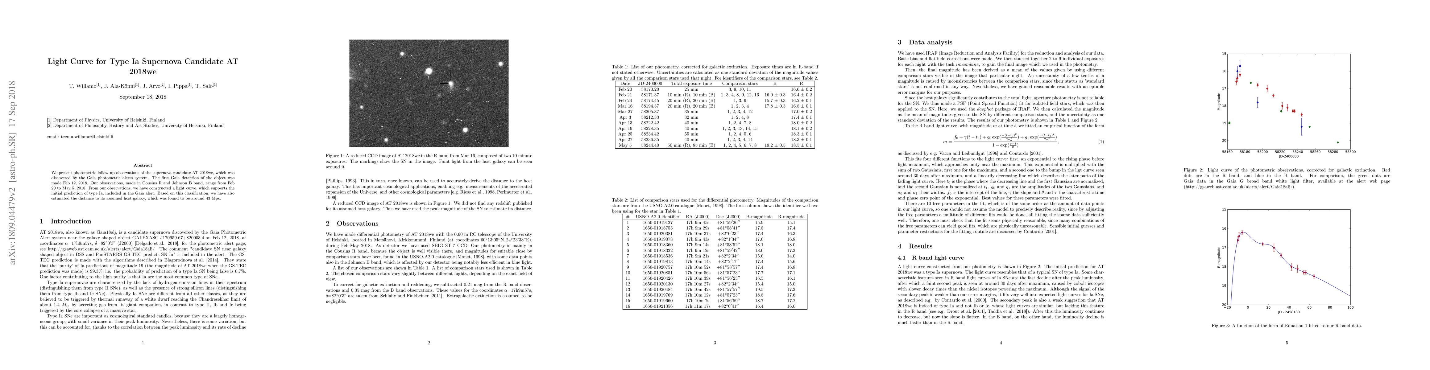 We present photometric follow-up observations of the supernova candidate AT 2018we, which was discovered by the Gaia photometric alerts system. The first Gaia detection of the object was made Feb 12, 2018. Our observations, made in Cousins R and Johnson B band, range from Feb 20 to May 5, 2018. From our observations, we have constructed a light curve, which supports the initial prediction of type Ia, included in the Gaia alert. Based on this classification, we have also estimated the distance to its assumed host galaxy, which was found to be around 43 Mpc.