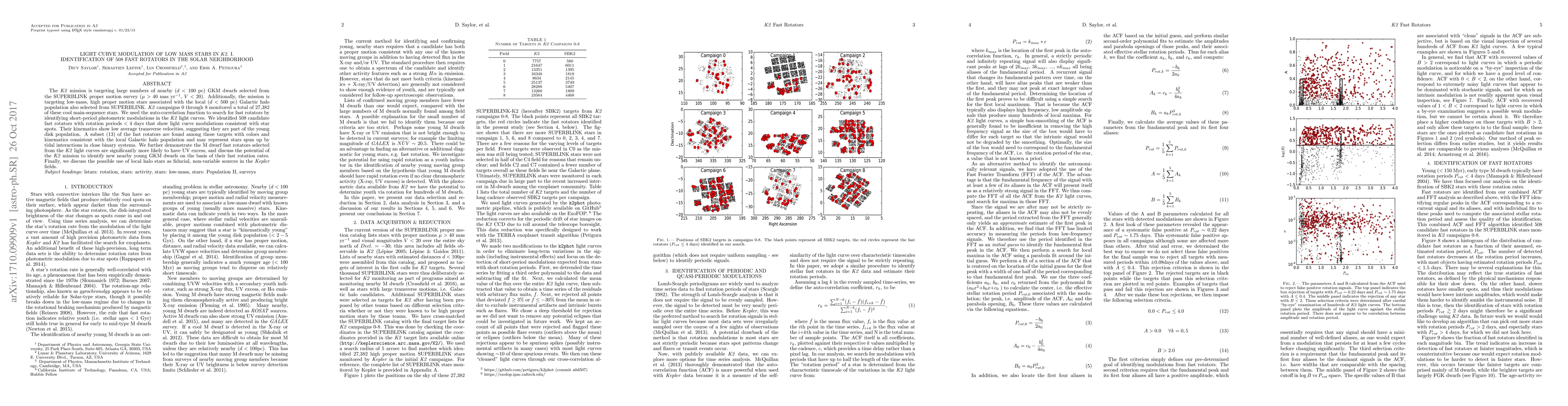 This study identifies 508 fast rotators among low-mass stars in the K2 mission's dataset, using light curve modulations to detect short-period photometric variations indicative of star spots. The fast rotators, with periods <4 days, are part of the young disk population, with some showing UV excess and potential tidal interactions in binary systems.