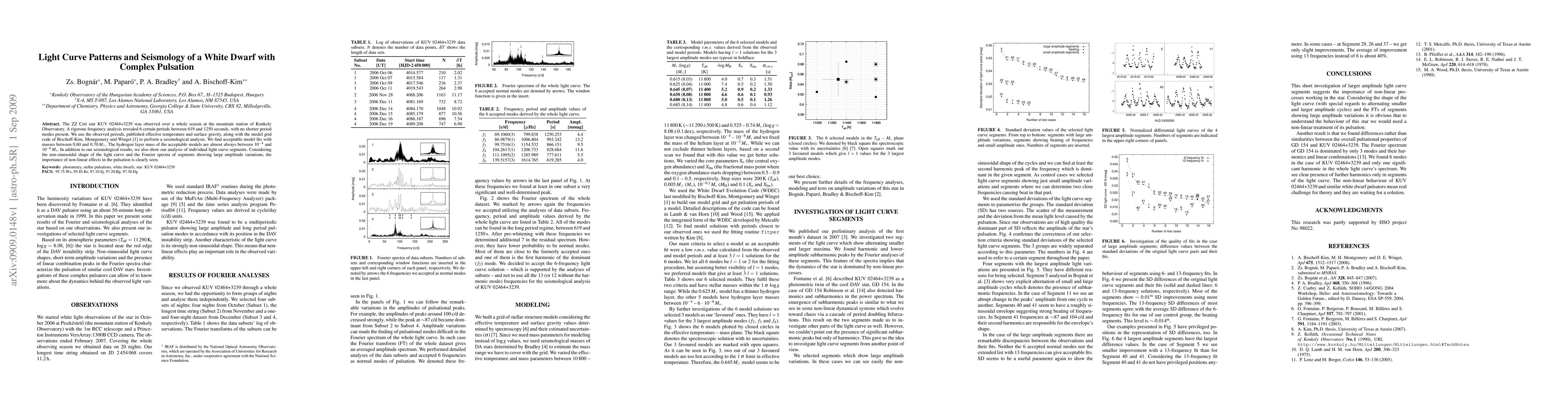 The research analyzed the ZZ Ceti star KUV 02464+3239, identifying 6 pulsation periods ranging from 619 to 1250 seconds. Using a model grid, they determined the white dwarf's mass (0.60-0.70 M_Sun) and hydrogen layer mass (10^-4 to 10^-6 M_*), highlighting the role of non-linear pulsation effects in shaping light curve patterns.