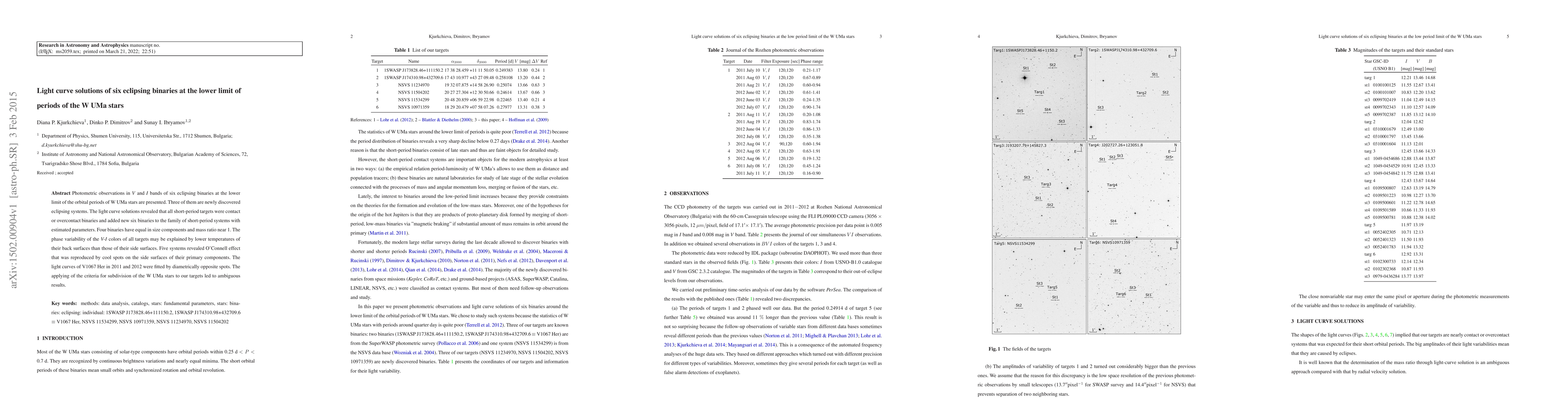 Photometric observations in V and I bands of six eclipsing binaries at the lower limit of the orbital periods of W UMa stars are presented. Three of them are newly discovered eclipsing systems. The light curve solutions revealed that all short-period targets were contact or overcontact binaries and added new six binaries to the family of short-period systems with estimated parameters. Four binaries have equal in size components and mass ratio near 1. The phase variability of the V-I colors of all targets may be explained by lower temperatures of their back surfaces than those of their side surfaces. Five systems revealed O'Connell effect that was reproduced by cool spots on the side surfaces of their primary components. The light curves of V1067 Her in 2011 and 2012 were fitted by diametrically opposite spots. The applying of the criteria for subdivision of the W UMa stars to our targets led to ambiguous results.