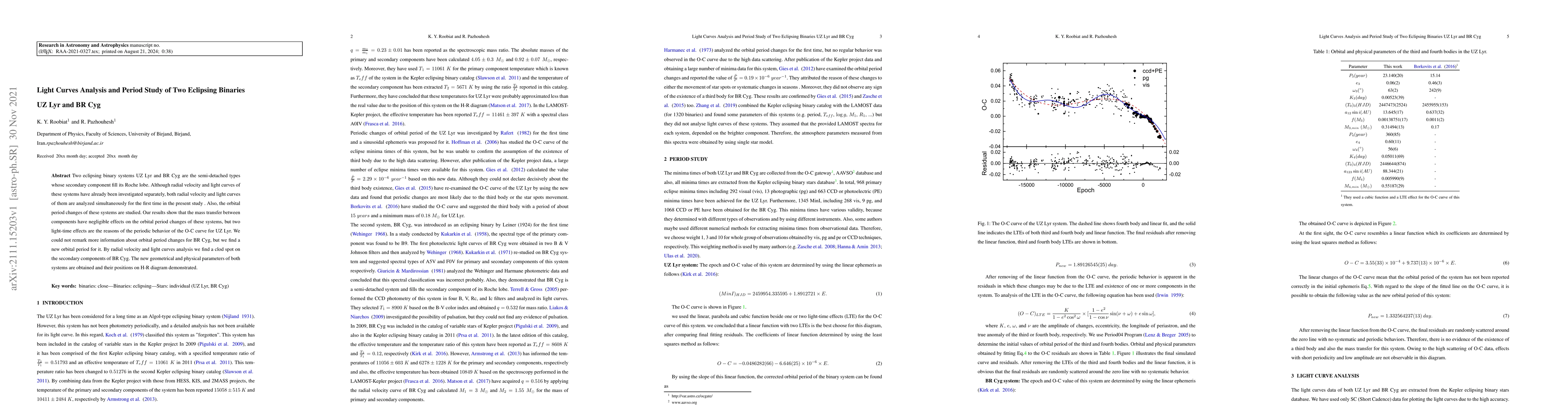 Two eclipsing binary systems UZ Lyr and BR Cyg are the semi-detached types whose secondary component fill its Roche lobe. Although radial velocity and light curves of these systems have already been investigated separately, both radial velocity and light curves of them are analyzed simultaneously for the first time in the present study . Also, the orbital period changes of these systems are studied. Our results show that the mass transfer between components have negligible effects on the orbital period changes of these systems, but two light-time effects are the reasons of the periodic behavior of the O-C curve for UZ Lyr. We could not remark more information about orbital period changes for BR Cyg, but we find a new orbital period for it. By radial velocity and light curves analysis we find a clod spot on the secondary components of BR Cyg. The new geometrical and physical parameters of both systems are obtained and their positions on H-R diagram demonstrated.