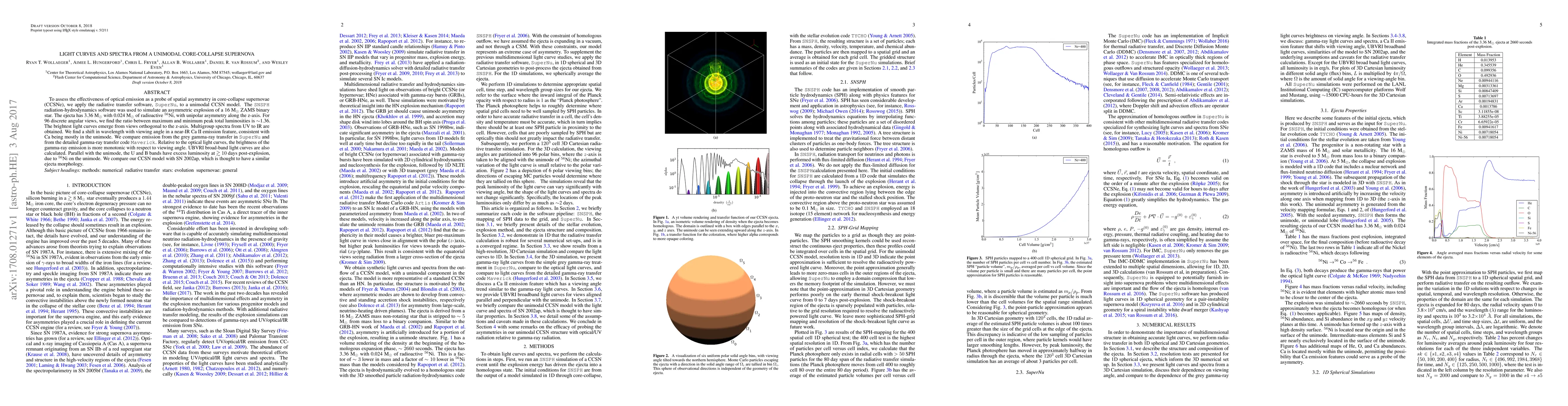 This research uses radiative transfer software supernu and radiation-hydrodynamics software snsph to simulate an asymmetric core-collapse supernova (CCSN) from a 16 M$_{odot}$ ZAMS binary star. The study finds that light curves vary by ~1.36 times between maximum and minimum views, with brightest emission orthogonal to the z-axis. Multigroup spectra show a shift in near-IR Ca II emission feature with viewing angle, and gamma-ray emission exhibits less variability compared to optical light curves. The model's findings are compared to SN 2002ap, suggesting similar ejecta morphology.