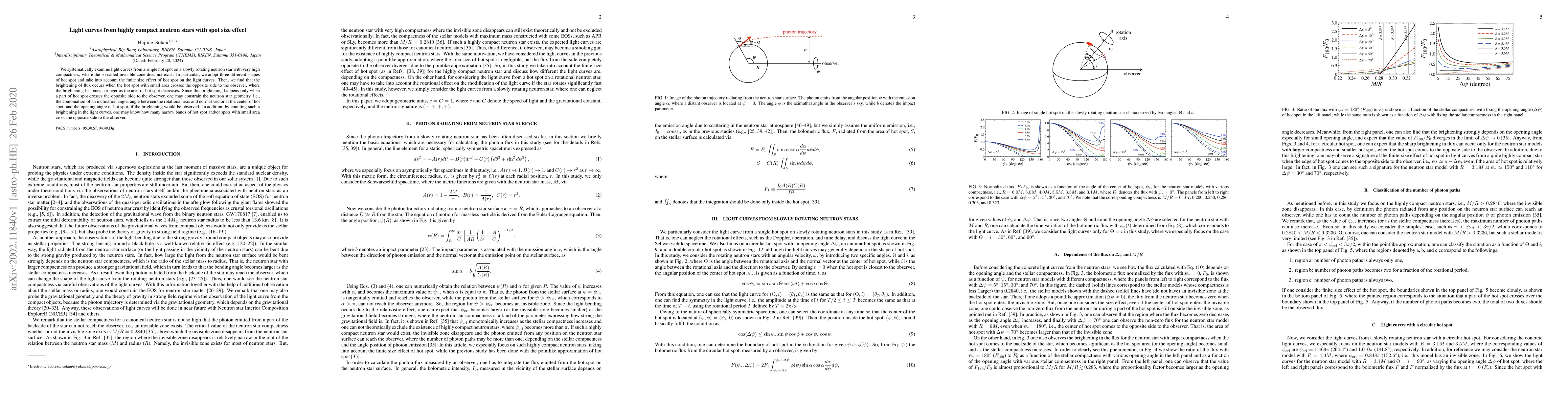 We systematically examine light curves from a single hot spot on a slowly rotating neutron star with very high compactness, where the so-called invisible zone does not exist. In particular, we adopt three different shapes of hot spot and take into account the finite size effect of hot spot on the light curves. Then, we find that the brightening of flux occurs when the hot spot with small area crosses the opposite side to the observer, where the brightening becomes stronger as the area of hot spot decreases. Since this brightening happens only when a part of hot spot crosses the opposite side to the observer, one may constrain the neutron star geometry, i.e., the combination of an inclination angle, angle between the rotational axis and normal vector at the center of hot spot, and the opening angle of hot spot, if the brightening would be observed. In addition, by counting such a brightening in the light curves, one may know how many narrow bands of hot spot and/or spots with small area cross the opposite side to the observer.