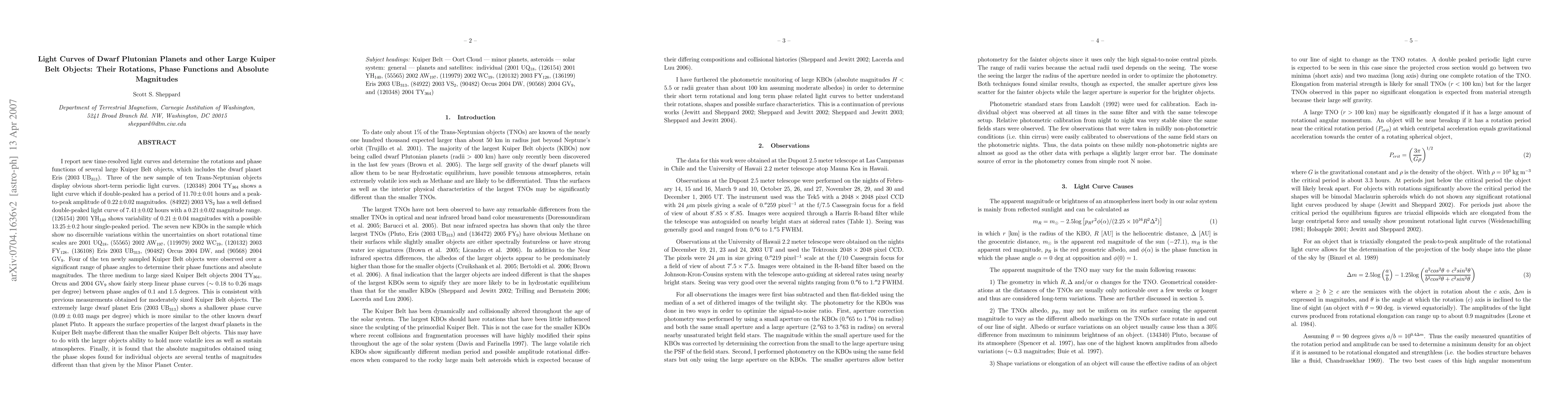 (Abridged) I report new light curves and determine the rotations and phase functions of several large Kuiper Belt objects, including the dwarf planet Eris (2003 UB313). (120348) 2004 TY364 shows a light curve which if double-peaked has a period of 11.70+-0.01 hours and peak-to-peak amplitude of 0.22+-0.02 magnitudes. (84922) 2003 VS2 has a well defined double-peaked light curve of 7.41+-0.02 hours with a 0.21+-0.02 magnitude range. (126154) 2001 YH140 shows variability of 0.21+-0.04 magnitudes with a possible 13.25+-0.2 hour single-peaked period. The seven new KBOs in the sample which show no discernible variations within the uncertainties on short rotational time scales are 2001 UQ18, (55565) 2002 AW197, (119979) 2002 WC19, (120132) 2003 FY128, (136108) Eris 2003 UB313, (90482) Orcus 2004 DW, and (90568) 2004 GV9. The three medium to large sized Kuiper Belt objects 2004 TY364, Orcus and 2004 GV9 show fairly steep linear phase curves (~0.18 to 0.26 mags per degree) between phase angles of 0.1 and 1.5 degrees. The extremely large dwarf planet Eris (2003 UB313) shows a shallower phase curve (0.09+-0.03 mags per degree) which is more similar to the other known dwarf planet Pluto. It appears the surface properties of the largest dwarf planets in the Kuiper Belt maybe different than the smaller Kuiper Belt objects. This may have to do with the larger objects ability to hold more volatile ices as well as sustain atmospheres. The absolute magnitudes obtained using the measured phase slopes are a few tenths of magnitudes different from those given by the MPC.