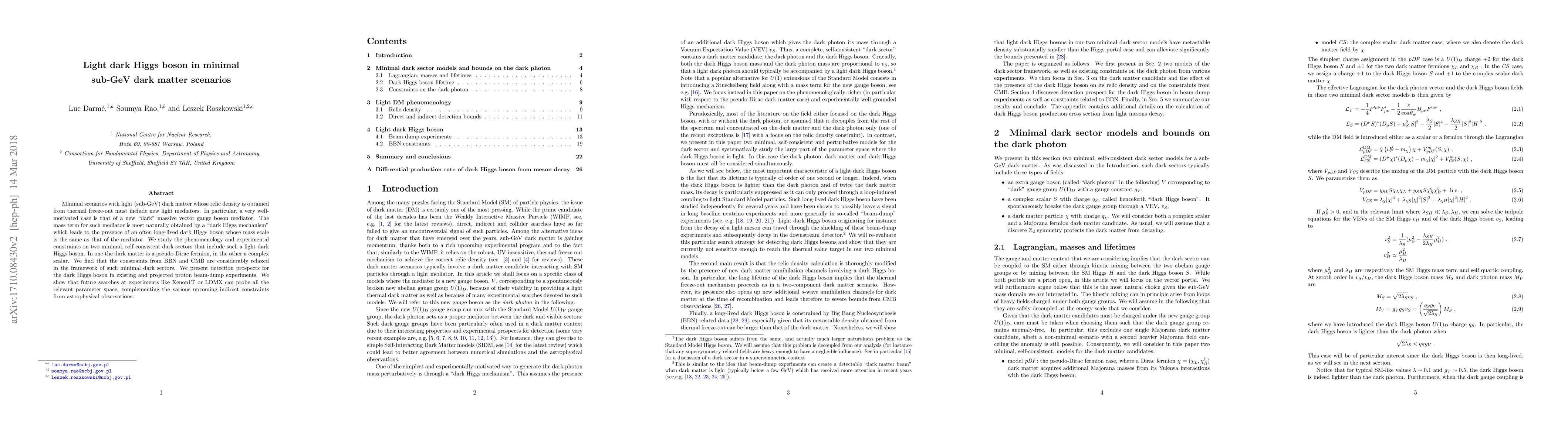 This paper explores minimal sub-GeV dark matter scenarios featuring a light dark Higgs boson as a mediator, examining two self-consistent dark sectors with different dark matter candidates. It finds relaxed constraints from BBN and CMB and discusses detection prospects for the dark Higgs boson in current and future experiments.
