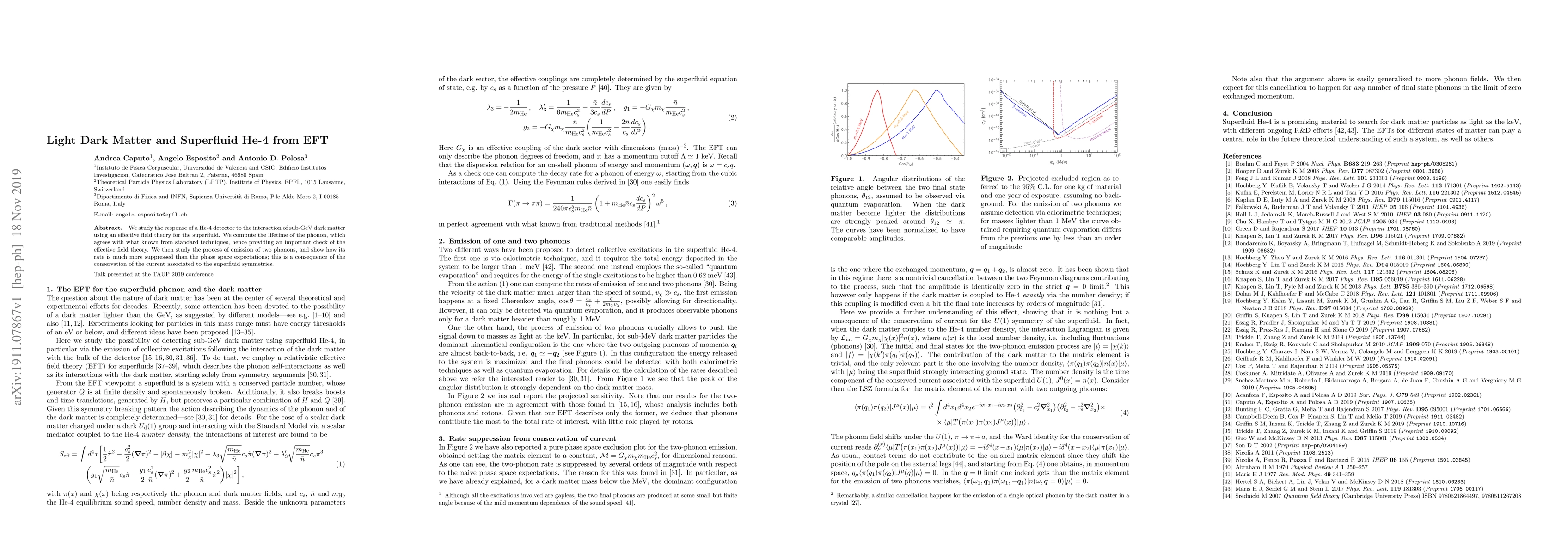 We study the response of a He-4 detector to the interaction of sub-GeV dark matter using an effective field theory for the superfluid. We compute the lifetime of the phonon, which agrees with what known from standard techniques, hence providing an important check of the effective field theory. We then study the process of emission of two phonons, and show how its rate is much more suppressed than the phase space expectations; this is a consequence of the conservation of the current associated to the superfluid symmetries.