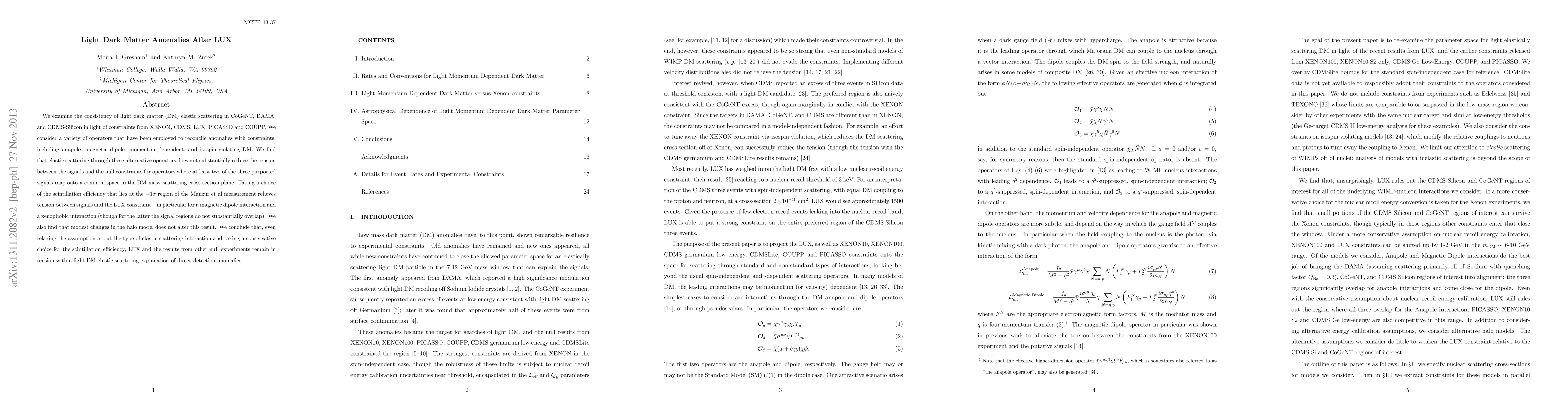 We examine the consistency of light dark matter (DM) elastic scattering in CoGeNT, DAMA, and CDMS-Silicon in light of constraints from XENON, CDMS, LUX, PICASSO and COUPP. We consider a variety of operators that have been employed to reconcile anomalies with constraints, including anapole, magnetic dipole, momentum-dependent, and isospin-violating DM. We find that elastic scattering through these alternative operators does not substantially reduce the tension between the signals and the null constraints for operators where at least two of the three purported signals map onto a common space in the DM mass--scattering cross-section plane. Taking a choice of the scintillation efficiency that lies at the $-1 \sigma$ region of the Manzur et al measurement relieves tension between signals and the LUX constraint---in particular for a magnetic dipole interaction and a xenophobic interaction (though for the latter the signal regions do not substantially overlap). We also find that modest changes in the halo model does not alter this result. We conclude that, even relaxing the assumption about the type of elastic scattering interaction and taking a conservative choice for the scintillation efficiency, LUX and the results from other null experiments remain in tension with a light DM elastic scattering explanation of direct detection anomalies.