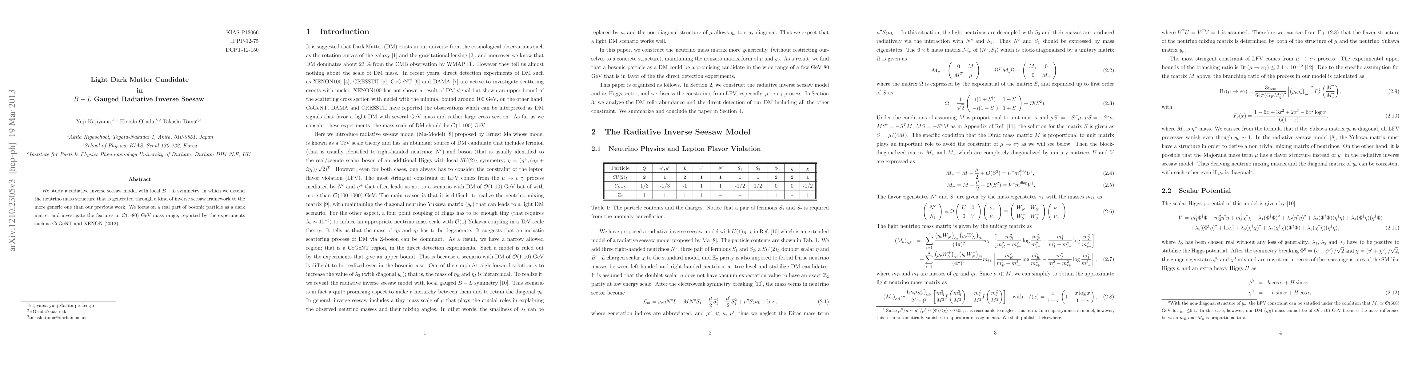 This paper explores a radiative inverse seesaw model with a local B-L gauge symmetry, proposing a bosonic particle's real part as a light dark matter candidate in the O(1-80) GeV mass range, relevant to experimental observations from CoGeNT and XENON (2012).