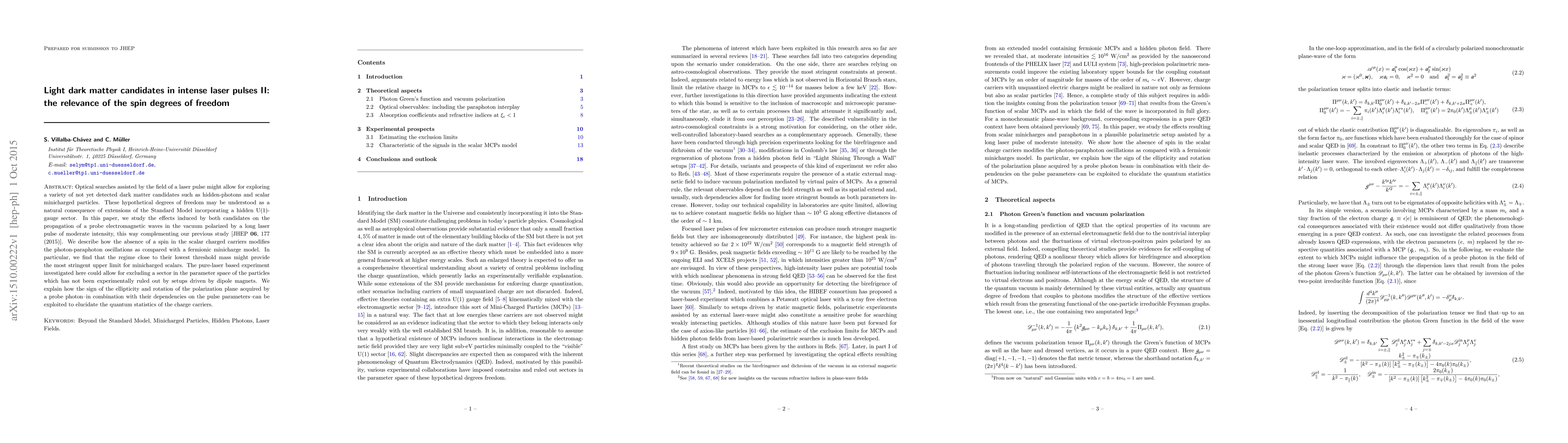 Optical searches assisted by the field of a laser pulse might allow for exploring a variety of not yet detected dark matter candidates such as hidden-photons and scalar minicharged particles. These hypothetical degrees of freedom may be understood as a natural consequence of extensions of the Standard Model incorporating a hidden $\rm U(1)$-gauge sector. In this paper, we study the effects induced by both candidates on the propagation of a probe electromagnetic waves in the vacuum polarized by a long laser pulse of moderate intensity, this way complementing our previous study [JHEP \textbf{06}, $177$ ($2015$)]. We describe how the absence of a spin in the scalar charged carriers modifies the photon-paraphoton oscillations as compared with a fermionic minicharge model. In particular, we find that the regime close to their lowest threshold mass might provide the most stringent upper limit for minicharged scalars. The pure-laser based experiment investigated here could allow 23for excluding a sector in the parameter space of the particles which has not been experimentally ruled out by setups driven by dipole magnets. We explain how the sign of the ellipticity and rotation of the polarization plane acquired by a probe photon--in combination with their dependencies on the pulse parameters--can be exploited to elucidate the quantum statistics of the charge carriers.