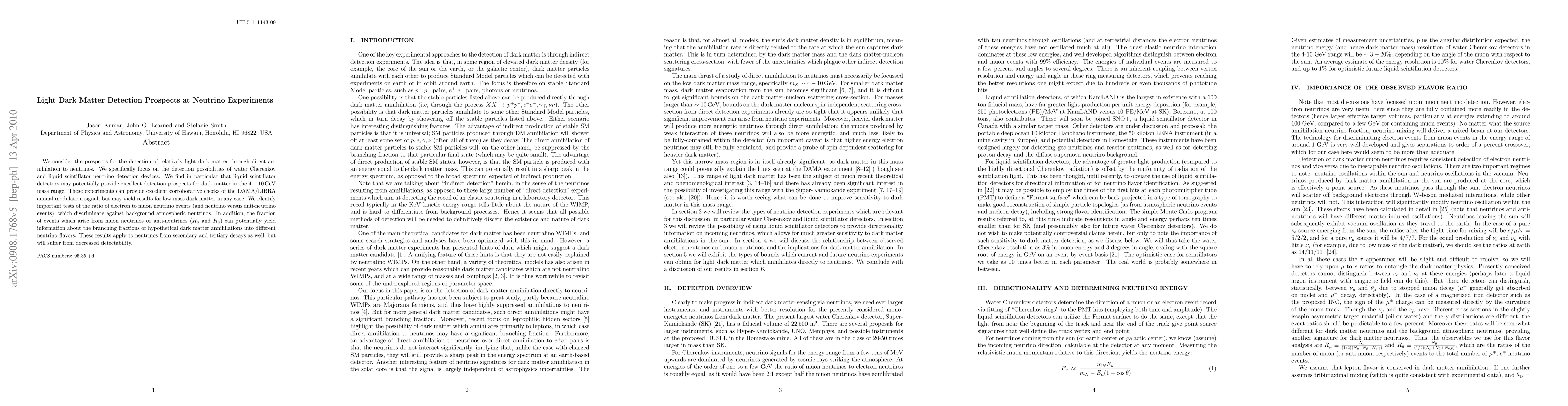 We consider the prospects for the detection of relatively light dark matter through direct annihilation to neutrinos. We specifically focus on the detection possibilities of water Cherenkov and liquid scintillator neutrino detection devices. We find in particular that liquid scintillator detectors may potentially provide excellent detection prospects for dark matter in the 4-10 GeV mass range. These experiments can provide excellent corroborative checks of the DAMA/LIBRA annual modulation signal, but may yield results for low mass dark matter in any case. We identify important tests of the ratio of electron to muon neutrino events (and neutrino versus anti-neutrino events), which discriminate against background atmospheric neutrinos. In addition, the fraction of events which arise from muon neutrinos or anti-neutrinos ($R_{\mu}$ and $R_{\bar \mu}$) can potentially yield information about the branching fractions of hypothetical dark matter annihilations into different neutrino flavors. These results apply to neutrinos from secondary and tertiary decays as well, but will suffer from decreased detectability.