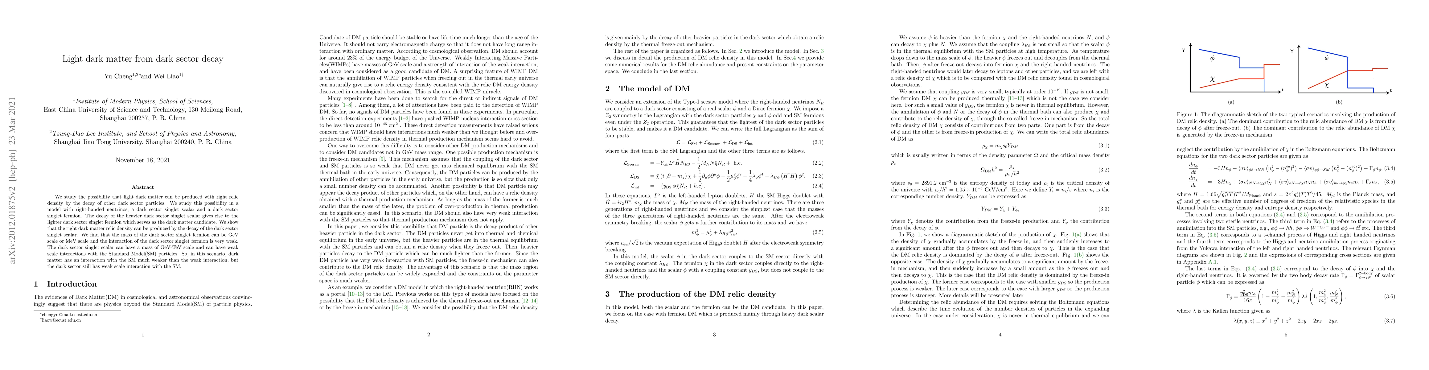 The research investigates the possibility of light dark matter production through decay of dark sector particles using a model with right-handed neutrinos, a dark sector singlet scalar, and a dark sector singlet fermion.