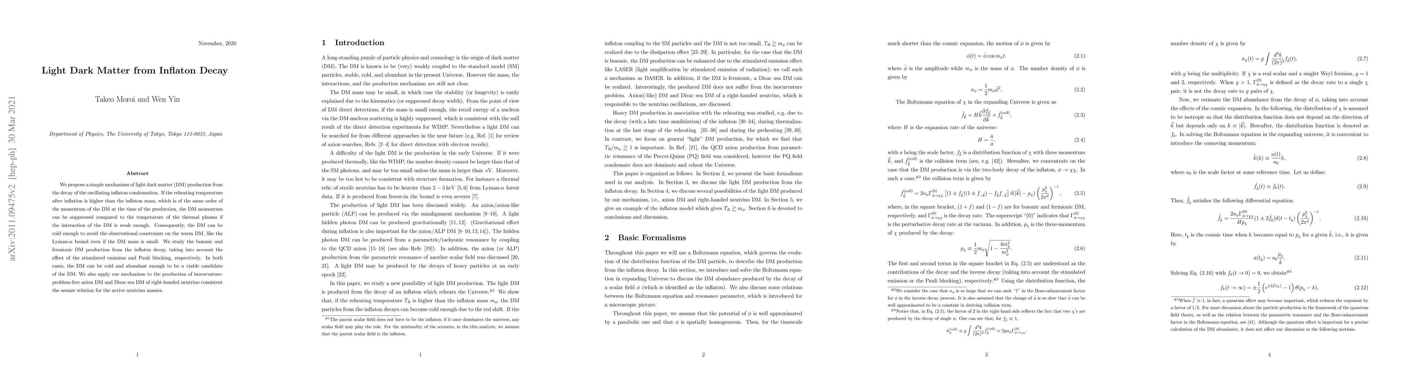 This paper proposes a mechanism for light dark matter production via the decay of the oscillating inflaton, suggesting that DM can remain cold and avoid warm DM constraints. The study explores both bosonic and fermionic DM production, considering stimulated emission and Pauli blocking, respectively, and applies the mechanism to axion and right-handed neutrino DM.