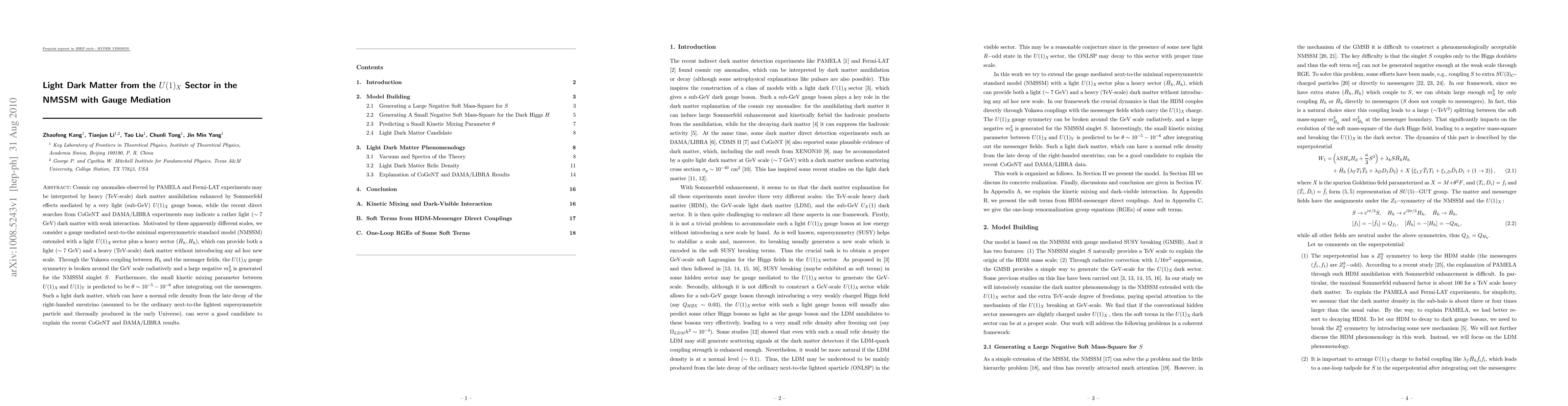 This paper explores a gauge-mediated NMSSM with a light U(1)_X sector that can explain both cosmic ray anomalies and direct dark matter detection signals. It proposes a model where a sub-GeV U(1)_X gauge boson mediates TeV-scale dark matter annihilation and a ~7 GeV dark matter candidate arises naturally without introducing new scales.