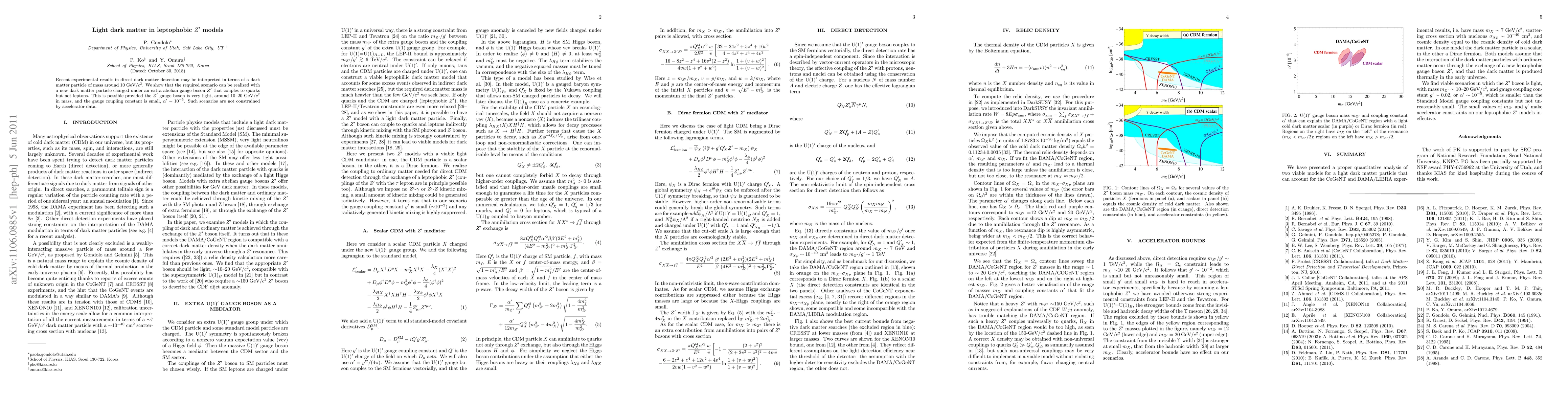 Recent experimental results in direct dark matter detection may be interpreted in terms of a dark matter particle of mass around 10 GeV/c^2. We show that the required scenario can be realized with a new dark matter particle charged under an extra abelian gauge boson Z' that couples to quarks but not leptons. This is possible provided the Z' gauge boson is very light, around 10-20 GeV/c^2 in mass, and the gauge coupling constant is small, alpha' ~ 10^(-5). Such scenarios are not constrained by accelerator data.