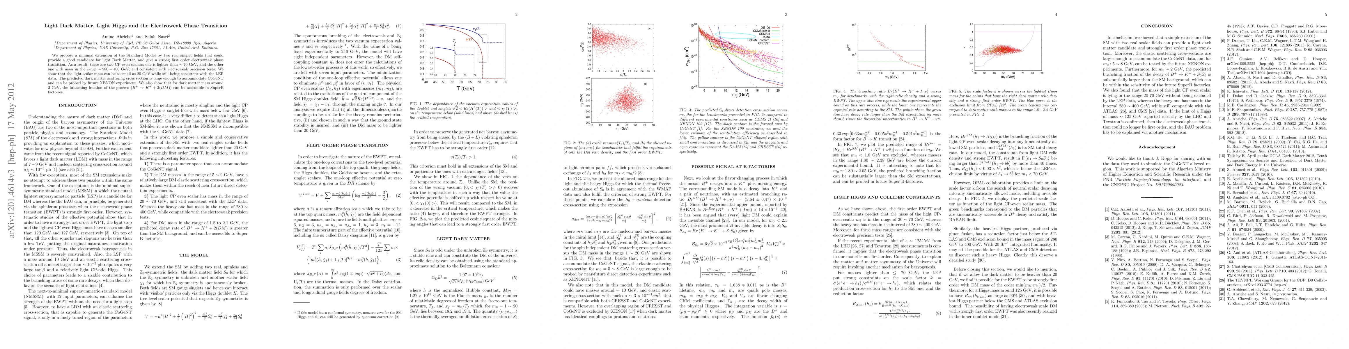 We propose a minimal extension of the Standard Model by two real singlet fields that could provide a good candidate for light Dark Matter, and give a strong first order electroweak phase transition. As a result, there are two CP even scalars; one is lighter than \sim 70 GeV, and the other one with mass in the range of 280-400 GeV; and consistent with electroweak precision tests. We show that the light scalar mass can be as small as 25 GeV while still being consistent with the LEP data. The predicted dark matter scattering cross section is large enough to accommodate CoGeNT and can be probed by future XENON experiment. We also show that for dark matter mass around 2 GeV, the branching fraction of the process (B^+\rightarrowK^++2(DM)) can be accessible in SuperB factories.