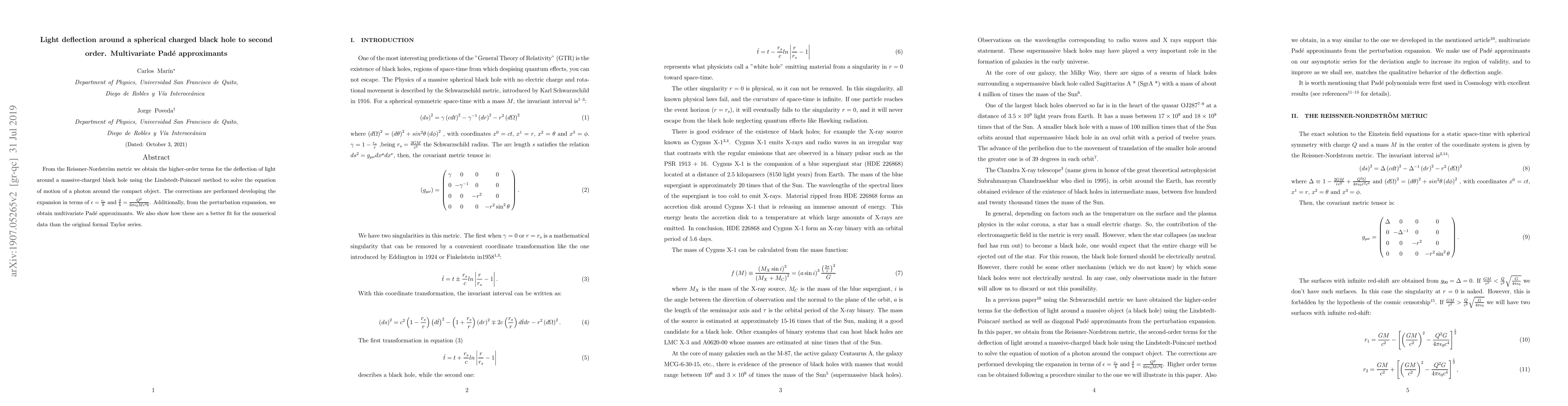 From the Reissner-Nordstrom metric we obtain the higher-order terms for the deflection of light around a massive-charged black hole using the Lindstedt-Poincar\'e method to solve the equation of motion of a photon around the compact object. The corrections are performed developing the expansion in terms of $\epsilon=\frac{r_{c}}{b}$ and $\frac{\delta}{b}= \frac{Q^{2}}{6 \pi \epsilon_{0}Mc^{2} b}$. Additionally, from the perturbation expansion, we obtain multivariate Pad\'e approximants. We also show how these are a better fit for the numerical data than the original formal Taylor series.