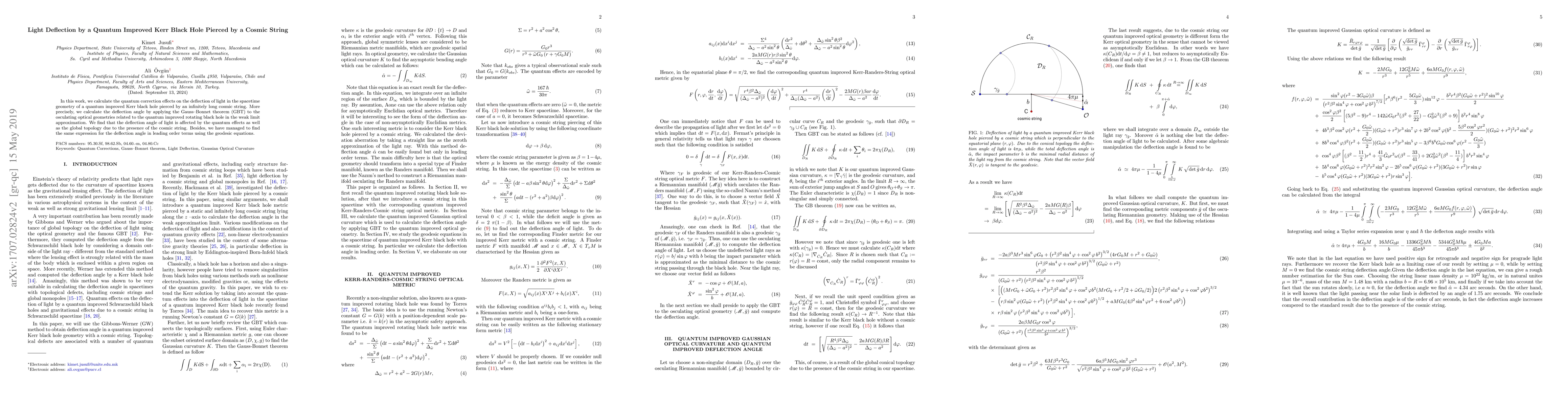 In this work, we calculate the quantum correction effects on the deflection of light in the spacetime geometry of a quantum improved Kerr black hole pierced by an infinitely long cosmic string. More precisely, we calculate the deflection angle by applying the Gauss--Bonnet theorem (GBT) to the osculating optical geometries related to the quantum improved rotating black hole in the weak limit approximation. We find that the deflection angle of light is affected by the quantum effects as well as the global topology due to the presence of the cosmic string. Besides, we have managed to find the same expression for the deflection angle in leading order terms using the geodesic equations.