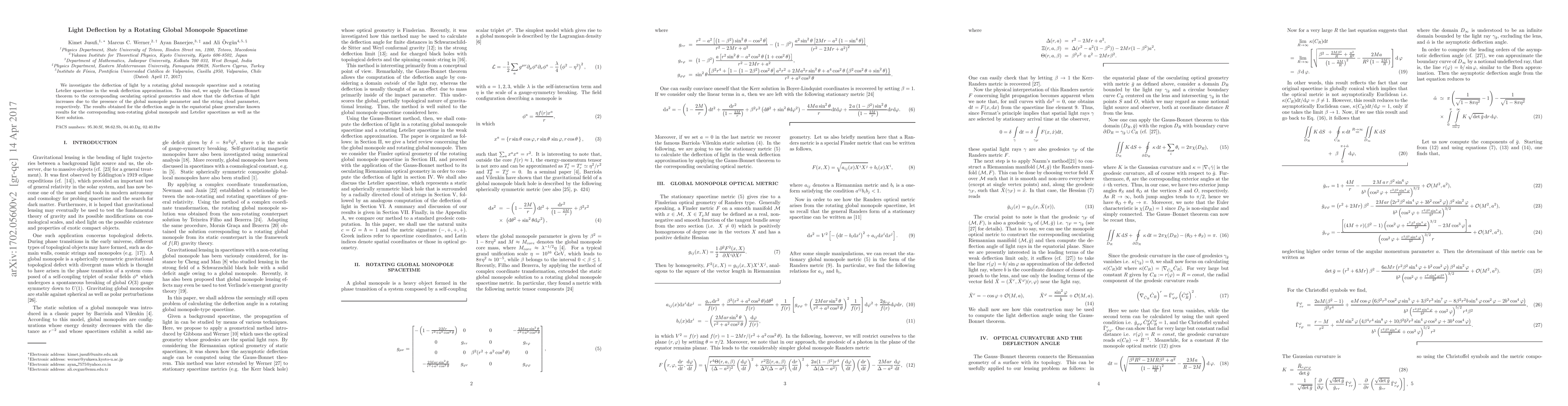 We investigate the deflection of light by a rotating global monopole spacetime and a rotating Letelier spacetime in the weak deflection approximation. To this end, we apply the Gauss-Bonnet theorem to the corresponding osculating optical geometries and show that the deflection of light increases due to the presence of the global monopole parameter and the string cloud parameter, respectively. The results obtained for the deflection angle in the equatorial plane generalize known results for the corresponding non-rotating global monopole and Letelier spacetimes as well as the Kerr solution.
