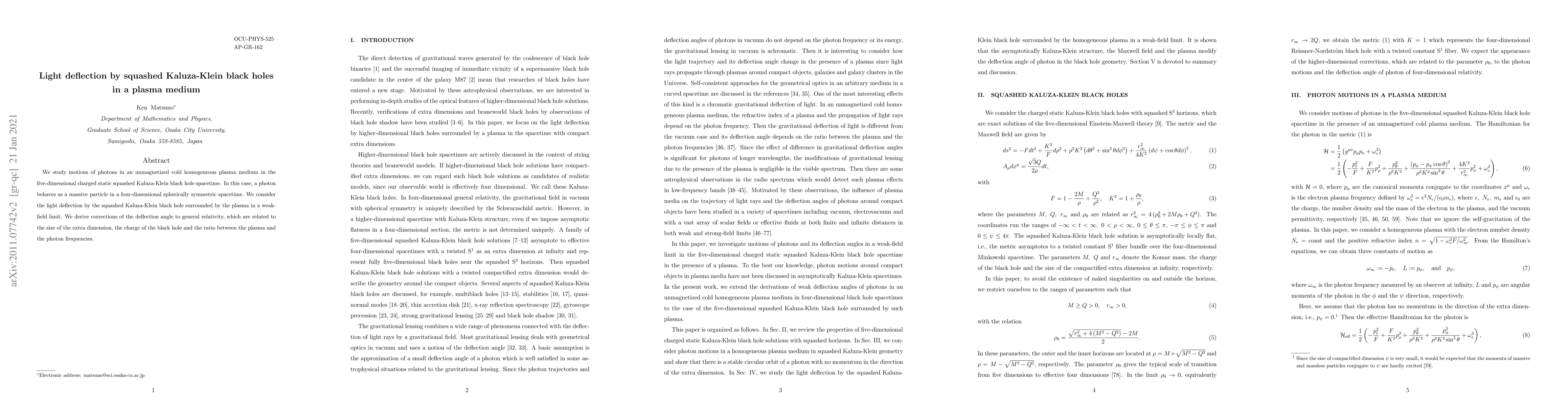 This paper investigates the deflection of light by squashed Kaluza-Klein black holes in a plasma medium, deriving corrections to general relativity's deflection angle that depend on the extra dimension's size, black hole charge, and the frequency ratio between plasma and photons. The study considers a weak-field limit in a five-dimensional charged static spacetime.