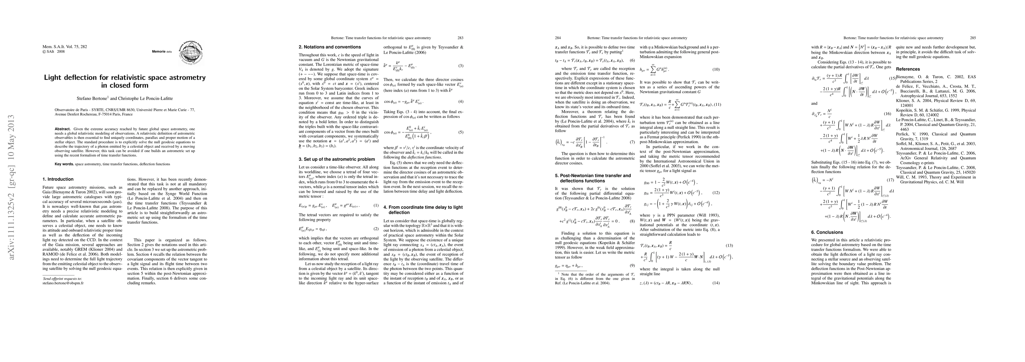 This paper proposes a novel method for relativistic space astrometry using closed-form light deflection equations, bypassing the need to explicitly solve null geodesic equations. It introduces a time transfer function formalism to uniquely determine stellar object coordinates, parallax, and proper motion.