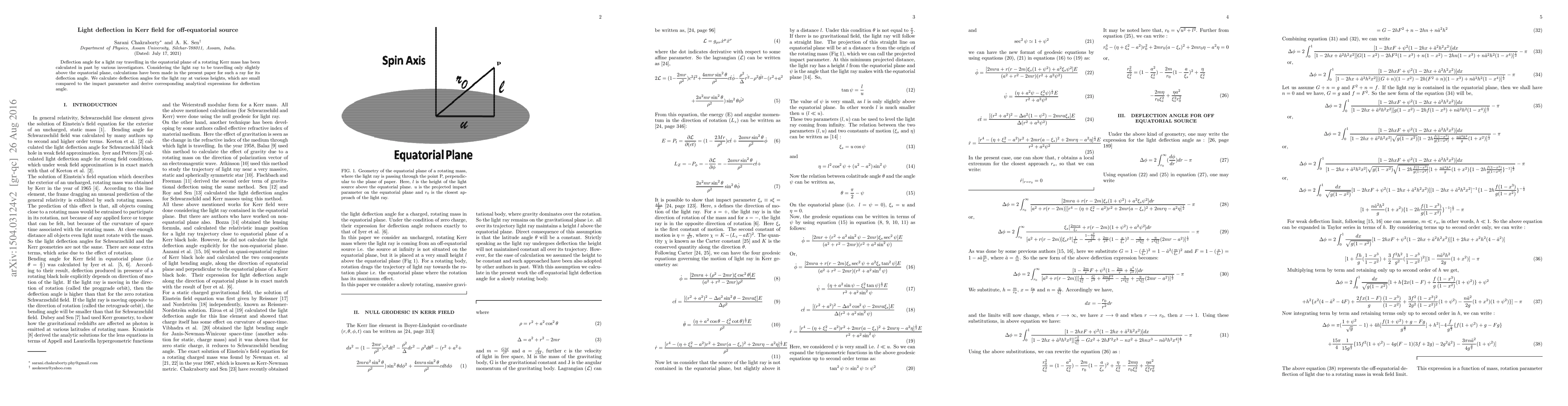 Deflection angle for a light ray travelling in the equatorial plane of a rotating Kerr mass has been already calculated by various investigators. Considering the light ray to be travelling only slightly above the equatorial plane, calculations have been made for such a ray for its deflection angle. In this paper, we calculate deflection angles for the light ray at various heights, which are small compared to the impact parameter and derive corresponding analytical expressions for deflection angle.