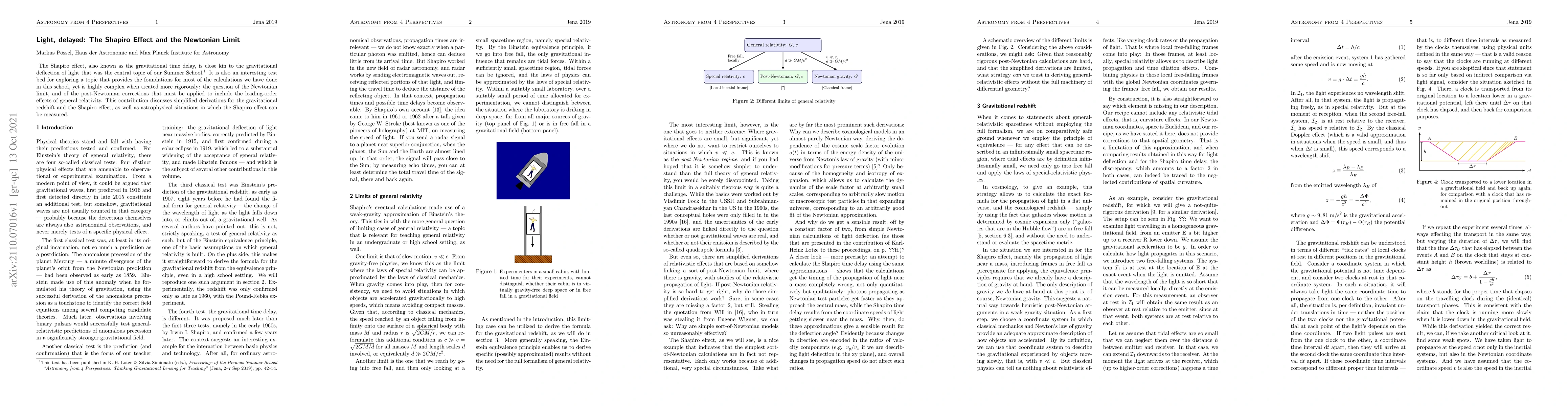 The Shapiro effect, also known as the gravitational time delay, is close kin to the gravitational deflection of light that was the central topic of our Summer School. It is also an interesting test bed for exploring a topic that provides the foundations for most of the calculations we have done in this school, yet is highly complex when treated more rigorously: the question of the Newtonian limit, and of the post-Newtonian corrections that must be applied to include the leading-order effects of general relativity. This contribution discusses simplified derivations for the gravitational redshift and the Shapiro effect, as well as astrophysical situations in which the Shapiro effect can be measured.