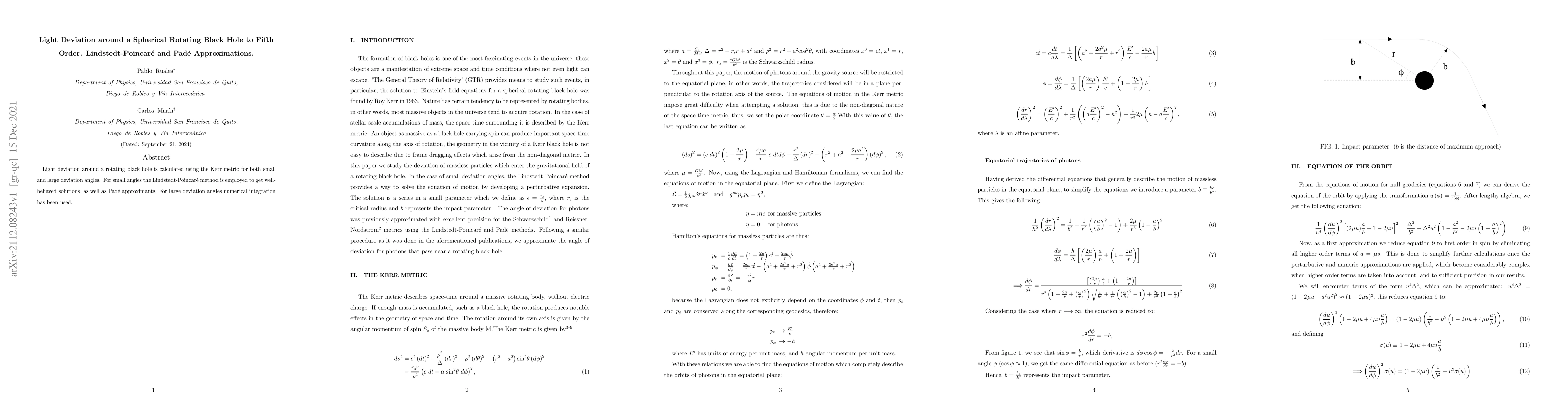 Light deviation around a rotating black hole is calculated using the Kerr metric for both small and large deviation angles. For small angles the Lindstedt-Poincar\'e method is employed to get well-behaved solutions, as well as Pad\'e approximants. For large deviation angles numerical integration has been used.