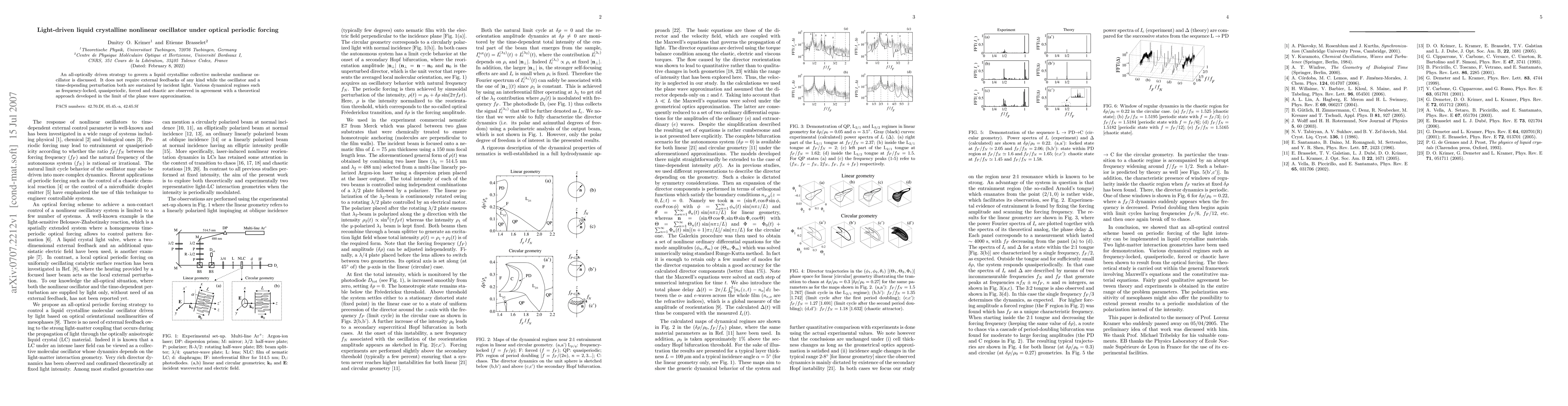 An all-optically driven strategy to govern a liquid crystalline collective molecular nonlinear oscillator is discussed. It does not require external feedbacks of any kind while the oscillator and a time-depending perturbation both are sustained by incident light. Various dynamical regimes such as frequency -locked, quasiperiodic, forced and chaotic are observed in agreement with a theoretical approach developed in the limit of the plane wave approximation.