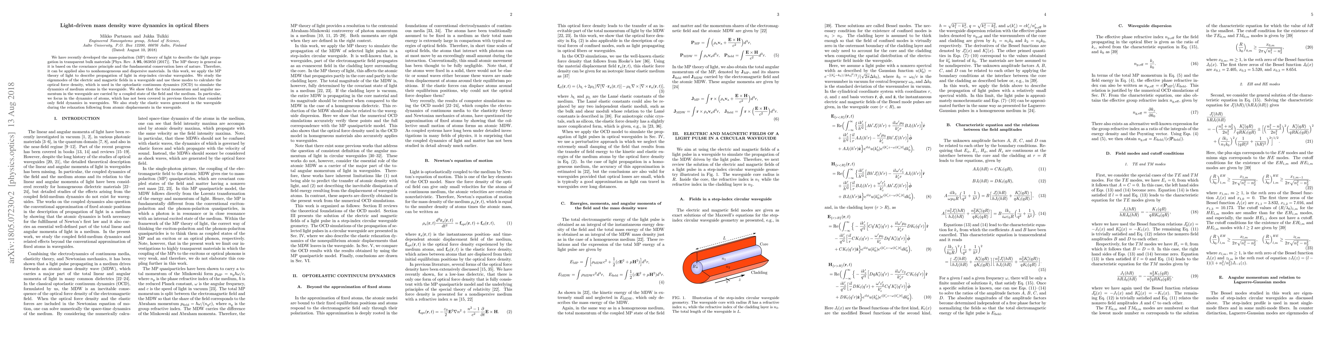 We have recently developed the mass-polariton (MP) theory of light to describe the light propagation in transparent bulk materials [Phys. Rev. A 95, 063850 (2017)]. The MP theory is general as it is based on the covariance principle and the fundamental conservation laws of nature. Therefore, it can be applied also to nonhomogeneous and dispersive materials. In this work, we apply the MP theory of light to describe propagation of light in step-index circular waveguides. We study the eigenmodes of the electric and magnetic fields in a waveguide and use these modes to calculate the optical force density, which is used in the optoelastic continuum dynamics (OCD) to simulate the dynamics of medium atoms in the waveguide. We show that the total momentum and angular momentum in the waveguide are carried by a coupled state of the field and the medium. In particular, we focus in the dynamics of atoms, which has not been covered in previous theories that consider only field dynamics in waveguides. We also study the elastic waves generated in the waveguide during the relaxation following from atomic displacements in the waveguide.