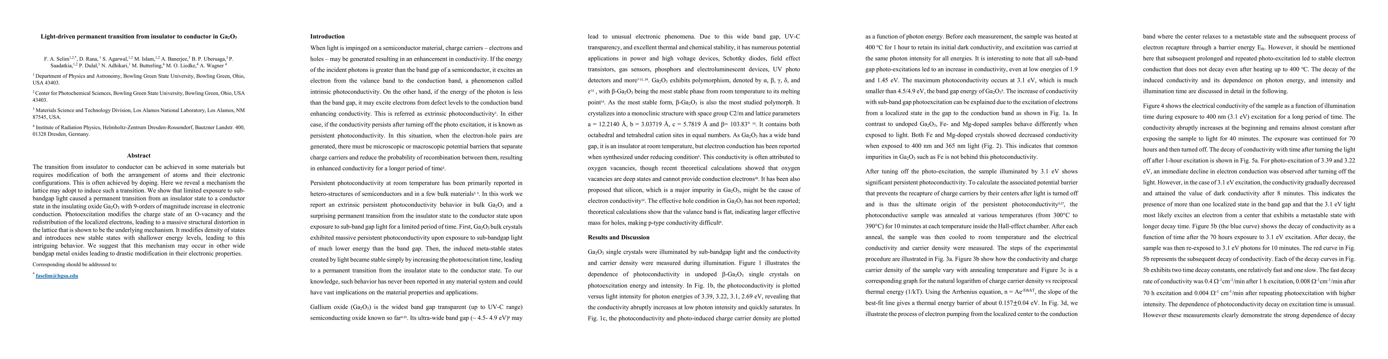This paper demonstrates a permanent transition from insulator to conductor in Ga2O3 induced by sub-bandgap light, resulting in a 9-order increase in electronic conduction. The mechanism involves photoexcitation modifying the charge state of oxygen vacancies and causing structural distortion, which alters the density of states and introduces new stable states.