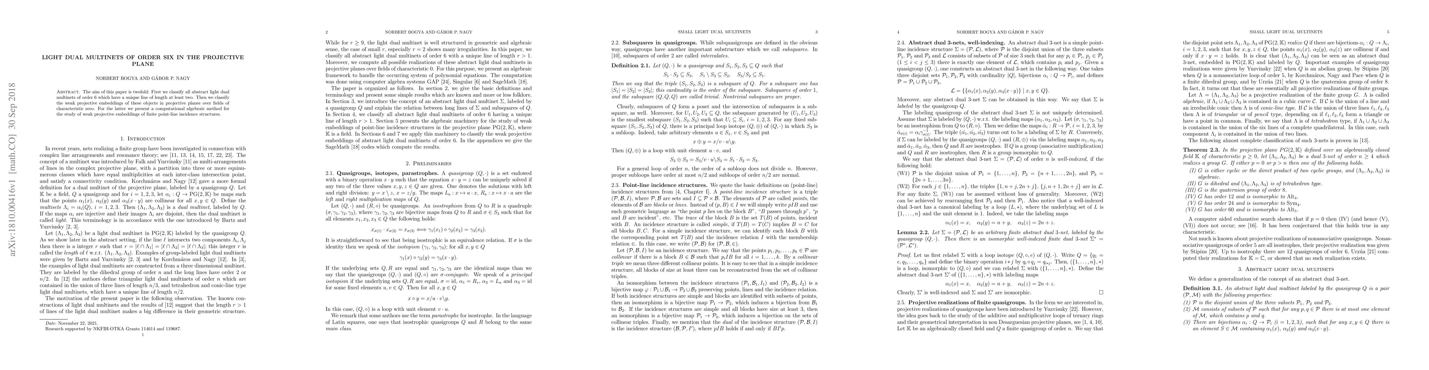 The aim of this paper is twofold: First we classify all abstract light dual multinets of order $6$ which have a unique line of length at least two. Then we classify the weak projective embeddings of these objects in projective planes over fields of characteristic zero. For the latter we present a computational algebraic method for the study of weak projective embeddings of finite point-line incidence structures.